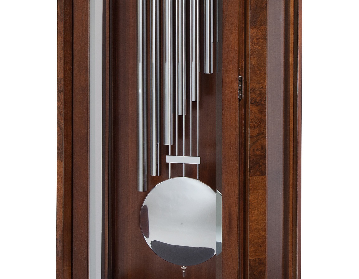 Watch outdoor Harold H. Limited Edition II from an American manufacturer Howard Miller. The model with carved frame in walnut or solid rock. In the base - the base provides drawer storage key. The door and sides with beveled glass crystal. Round dial with chrome bezel. The pendulum is made of chrome plated steel. Classic design.