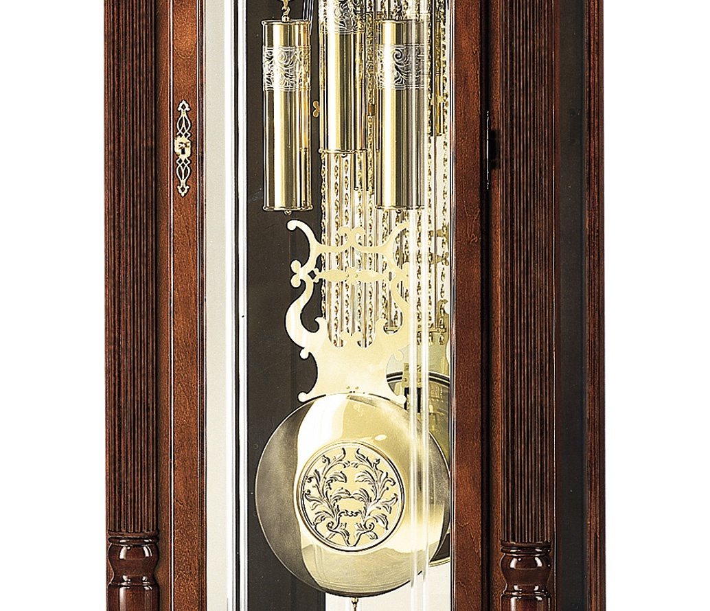 Watch outdoor Glenmour from the American manufacturer Howard Miller. A classic design with an elegant Swan neck pediment. Carved handmade hardwood case. Beveled crystal shutters of a door with the engraving. A mirrored back panel. Brass pendulum - Lira with matching decorative disk. Dial with Arabic numerals and stationary Astrological Moon dial.