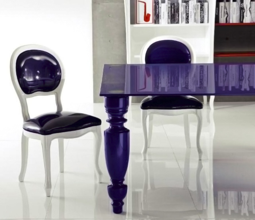 The Ego Comfor chair from the Italian manufacturer Moda. Frame - solid wood. Seat cover - leather with a filling of polyurethane. There are other options upholstery and trim. Chair with a high round back. The white furniture, the upholstery is blue, variations on the number of items. Created for the interior in the style glamor.