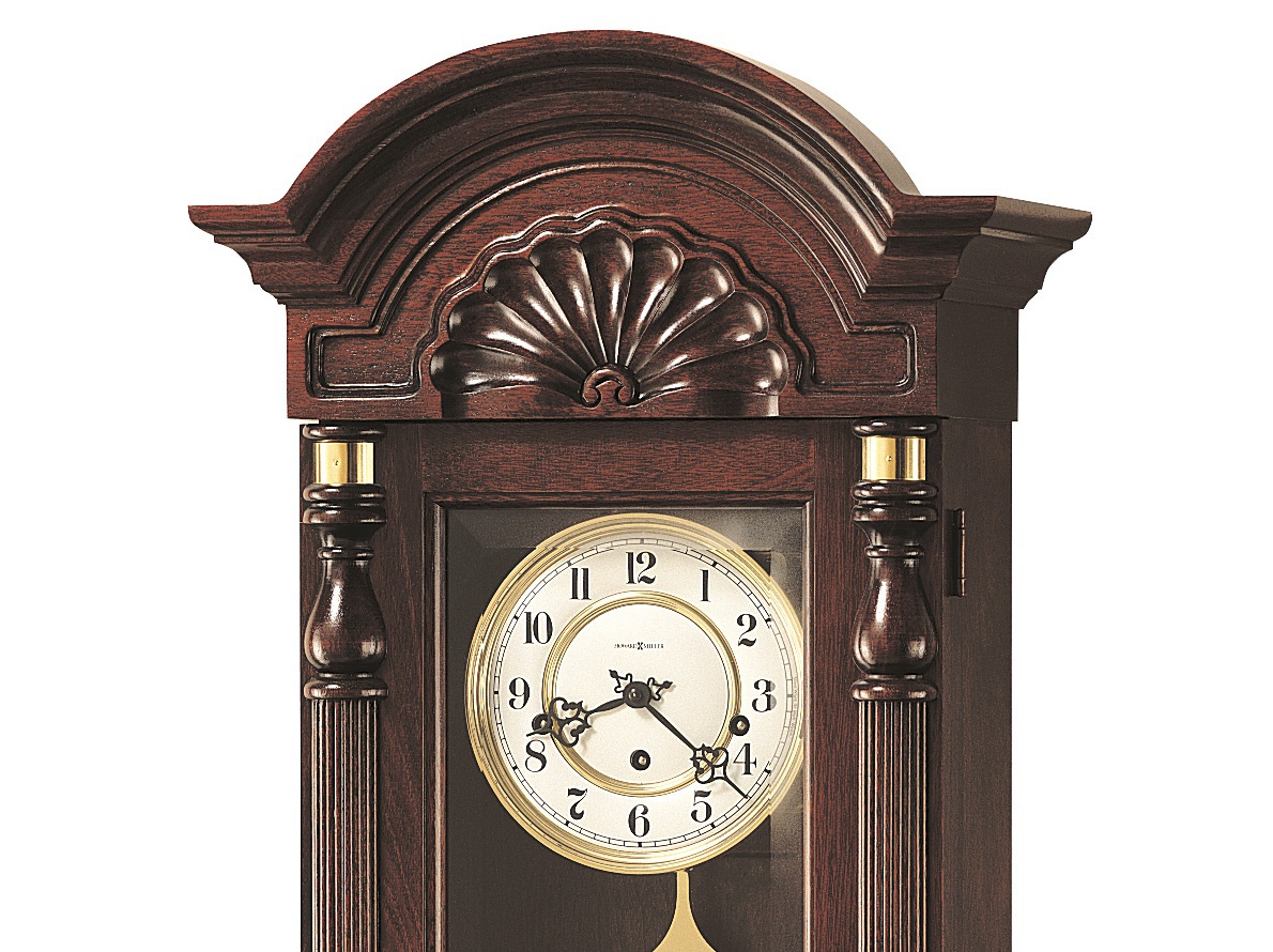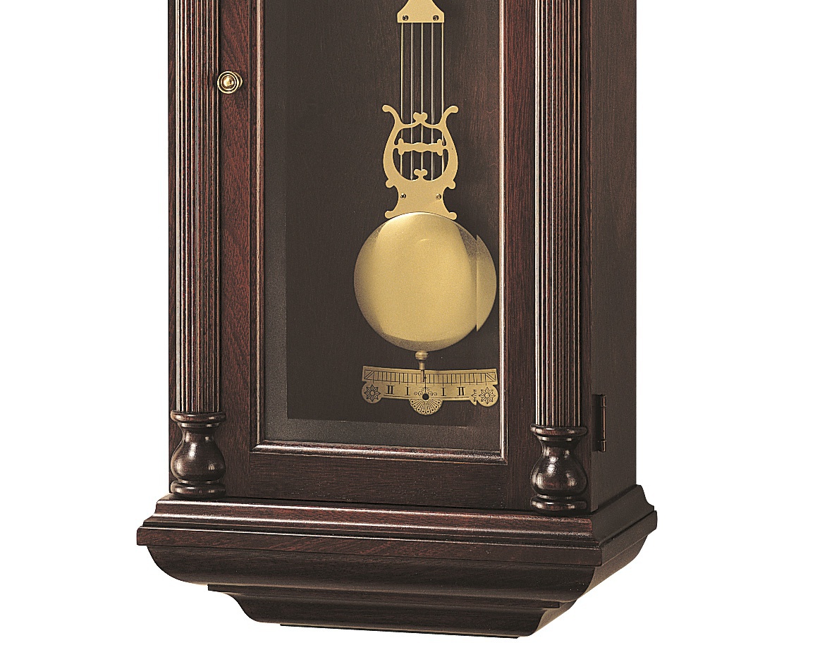 Jennison wall clock from the American manufacturer Howard Miller Frame - mahogany or choice hardwood and veneer. Individual model with carved wavy edge on the front. Polished Viennese dial is enamel coated and separate convex rings in the center and edge of the disc. Door with beveled glass crystal. Lyre pendulum and polished brass.