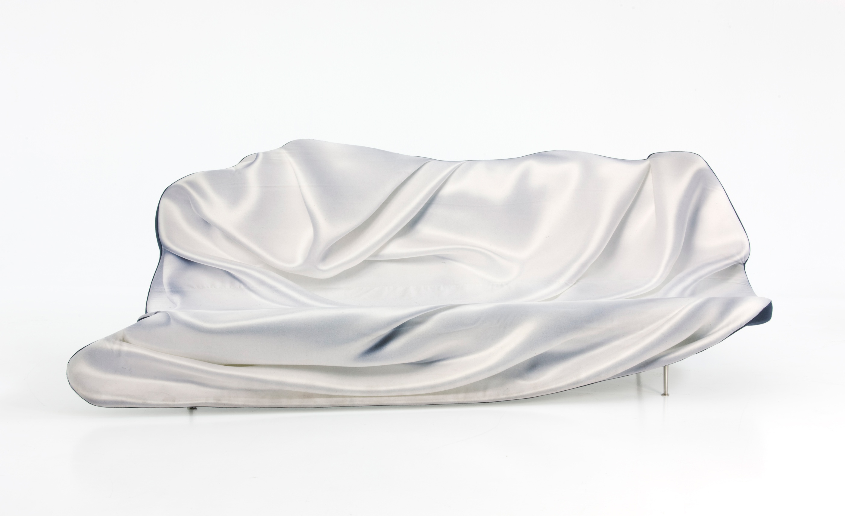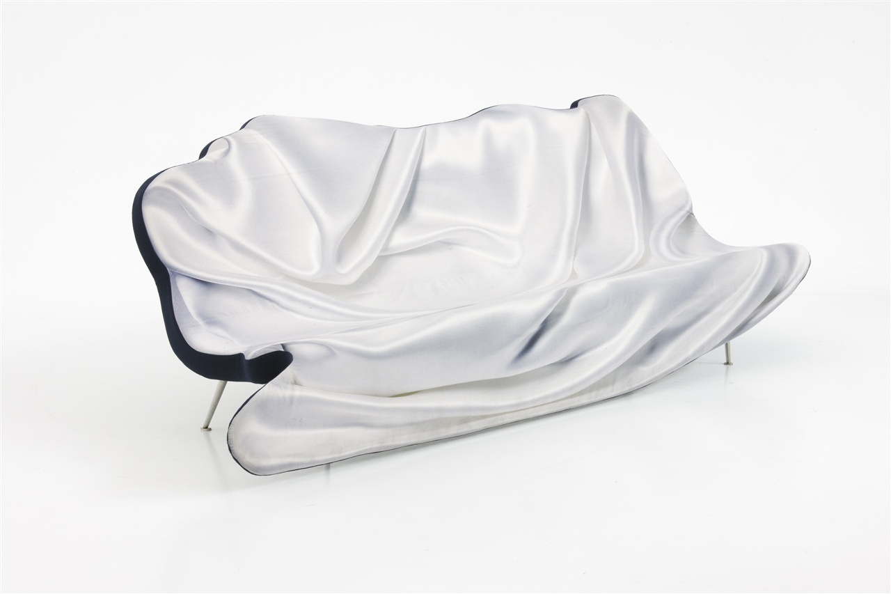 The Draped sofa Italian manufacturer Moroso. This model is from the collection of the Moment "Moment". Design suggestions Front. Island three seater sofa on a metal frame. Textile upholstery as if casually thrown over the sofa, forming numerous folds. Actually it is a cleverly created illusion: "drape" is a photo print on a smooth fabric. Color scheme in pastel colors.