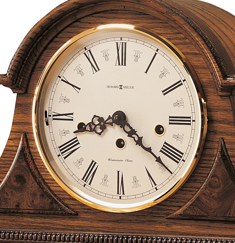 Desktop clock Worthington from the American manufacturer Howard Miller. The case is made of oak wood. Classic carved handmade polished glass. Roman dial with enamel and gold plated ring. The model is equipped with high-precision mechanism.
