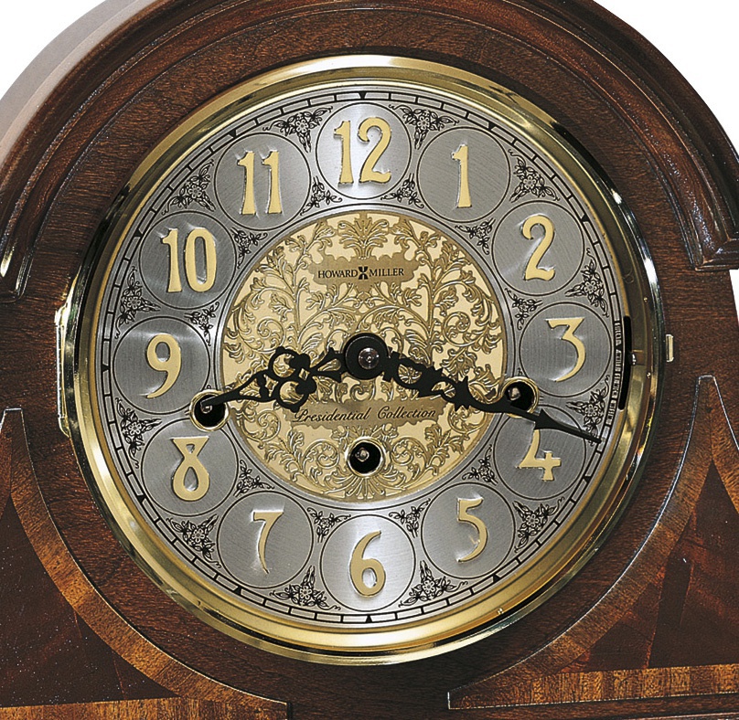 Desktop clock Webster from an American manufacturer Howard Miller. Elegant carved handmade frame of wood. The model with Arabic dial on a silver circle with a band of polished brass at the edge of the disk. In the center of a decorative figure with gold leaf.