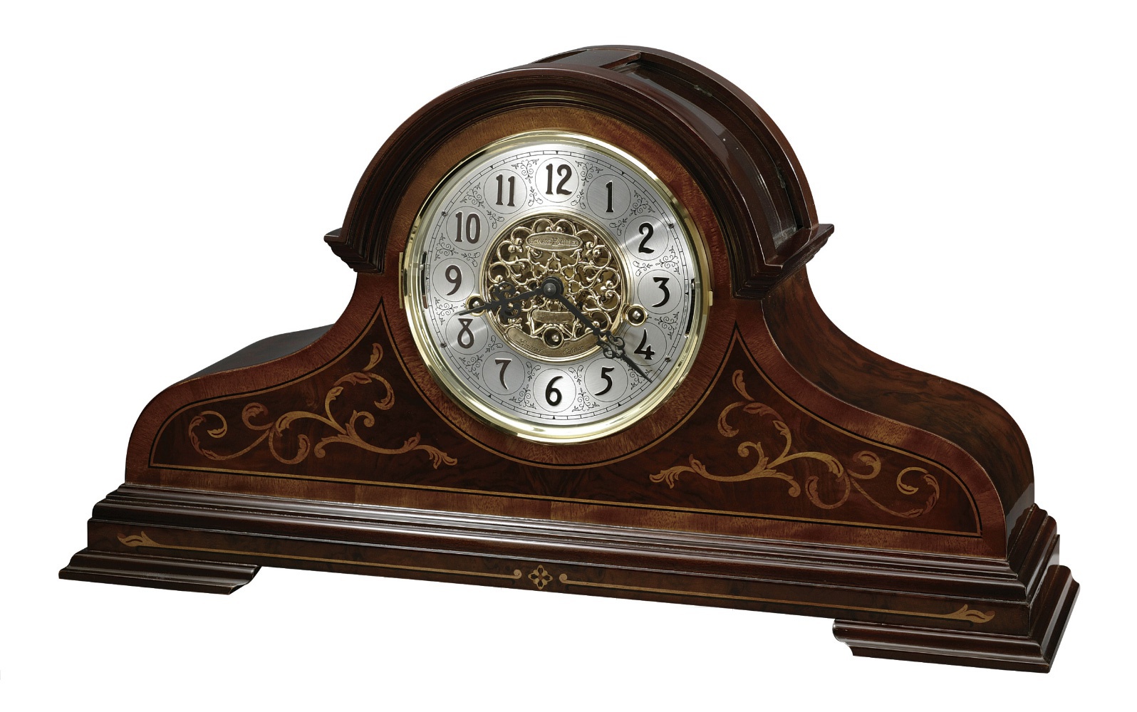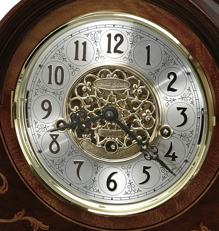 Desk clock Bradley from the American manufacturer Howard Miller. The frame is made of carved wood or solid cherry wood. The model with Arabic dial with brass ring. In the middle of the disk decorative pattern. Easy adjustment of all functions.