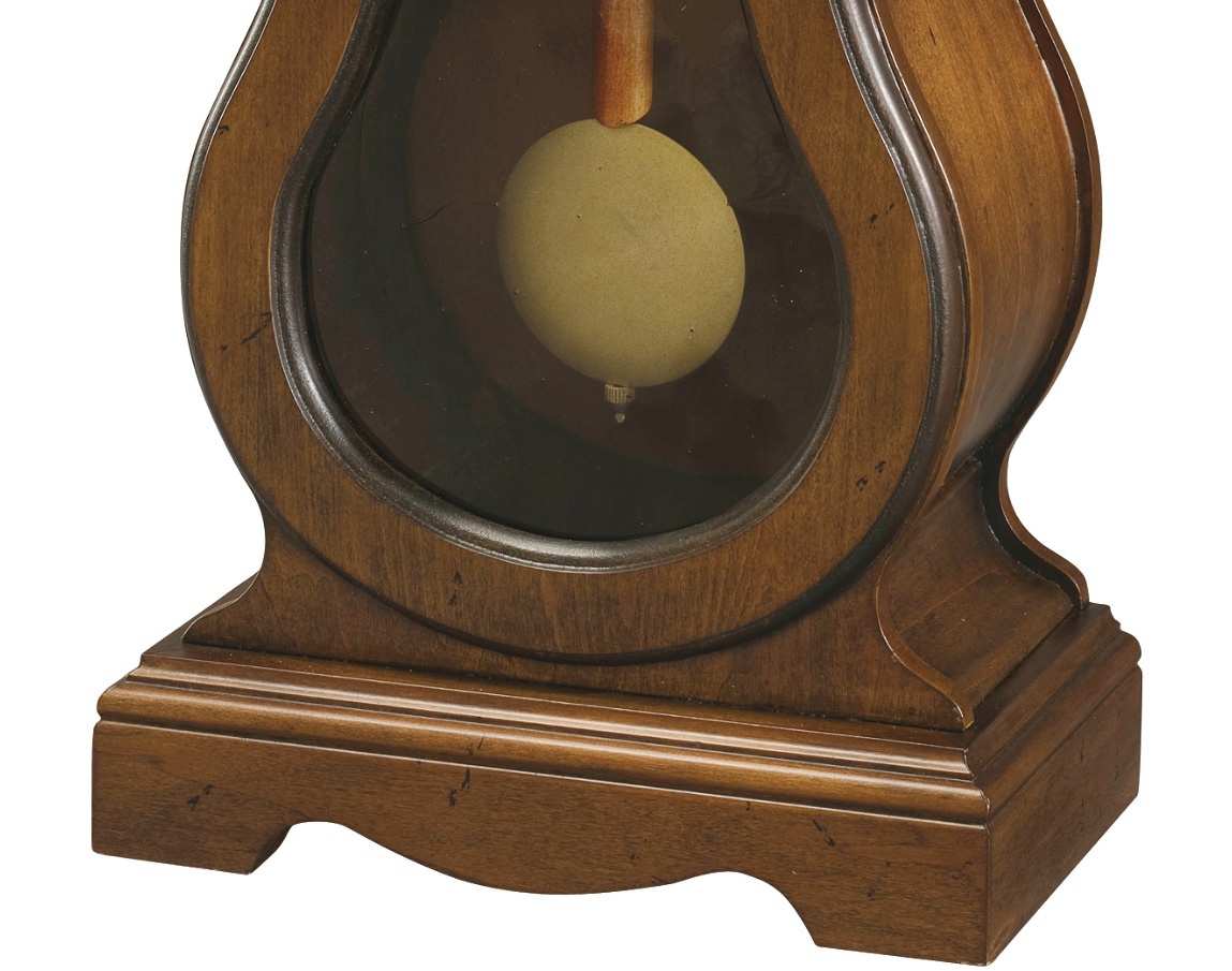 Cleo Mantel table clock from an American manufacturer Howard Miller. Model carved handmade case made of chestnut wood or hard wood. Roman dial with enamel. Door with convex glass. Pendulum with gold plating hand polishing. Features high-precision mechanism.