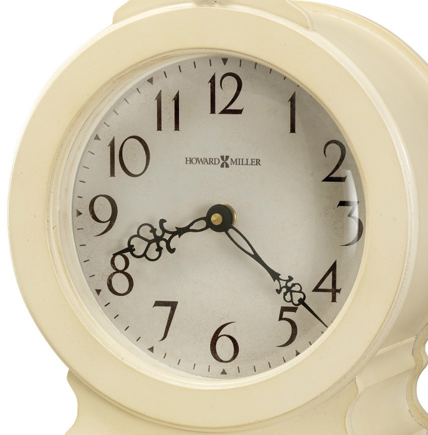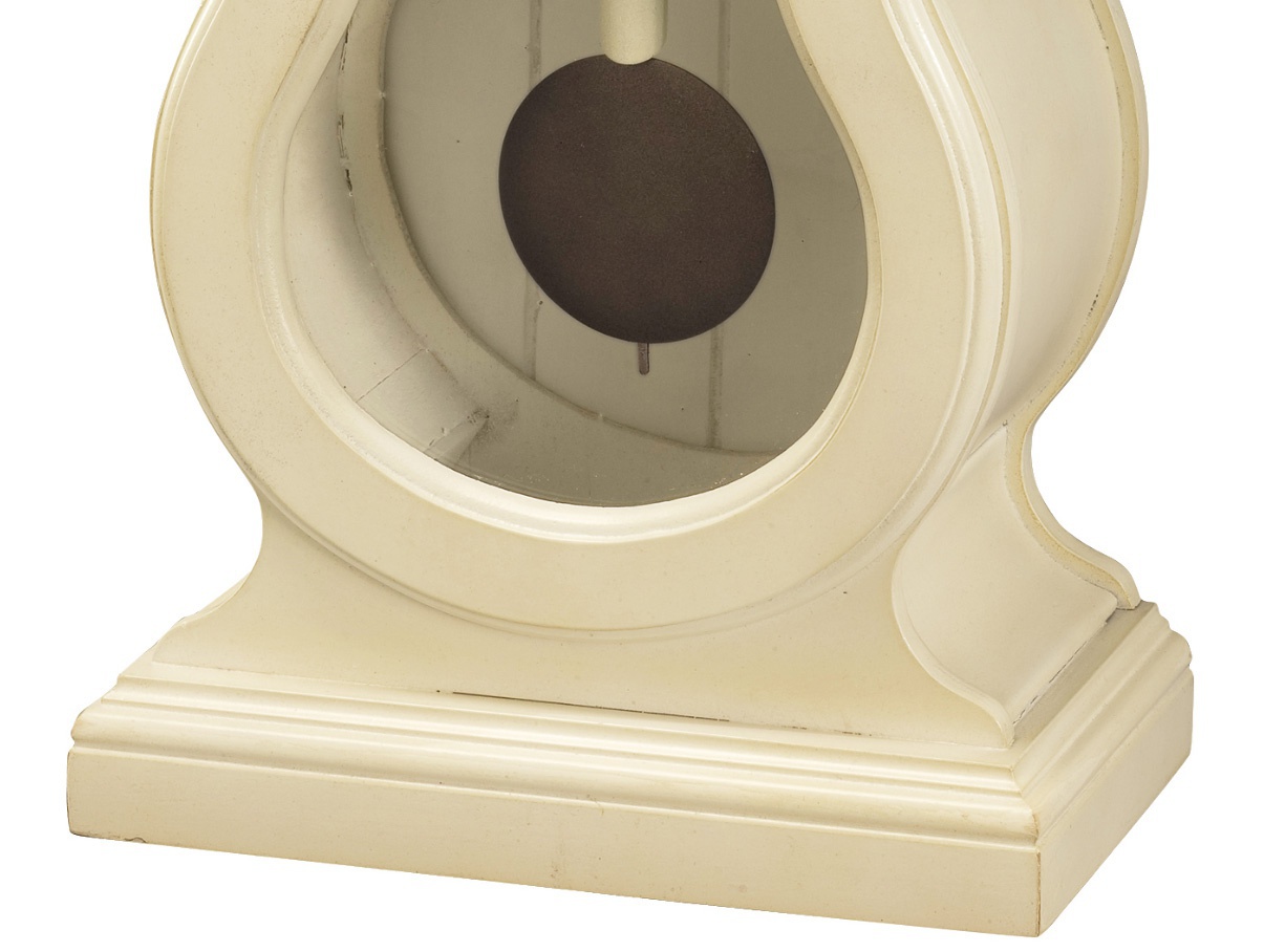 Audrey Mantel table clock from an American manufacturer Howard Miller. Model carved handmade case made of hard wood with white lacquer. Arabic dial with enamel. Door with convex glass. A pendulum coated hand-polished. Features high-precision mechanism.
