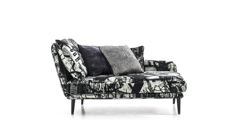 Daybed in fabric Sister Ray from the Italian manufacturer Moroso. The frame is made from solid wood with a filling of polyurethane foam of different densities. The legs are made of ash, the color on the catalog. Upholstered in viscose, velvet fabric with modern print - graffiti. The model is made in modern style.