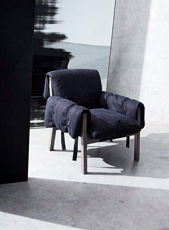 Strapped the chair from the Italian manufacturer Moroso. Chair frame is made of solid ash, painted in coal black or gray tone. On top of the chair is covered with soft mattress, filled with polyester fiber, fastened with large buckles and straps in military style. Color gamma is in military style: dark blue, khaki, black and sand color. Durable and comfortable chair is sure to brighten your interior.