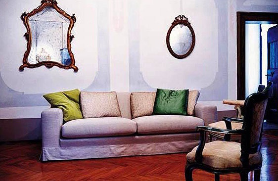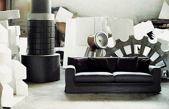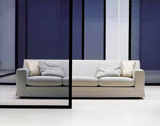 Sofa Adriano from the Italian manufacturer Moroso. Model on a frame of wood, filler polyurethane foam different densities and polyester fiber. Back pillows and additional decorative pillows filled with goose down. The legs are made of black polypropylene, on request, can be made of beech in different colors. Upholstery textile from the company portfolio. Color finish offers light and dark shades. The sofa will beautify your living room.