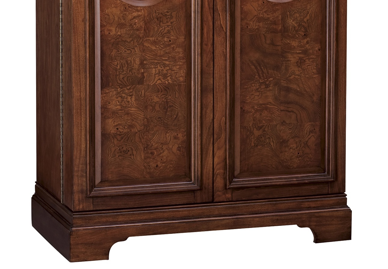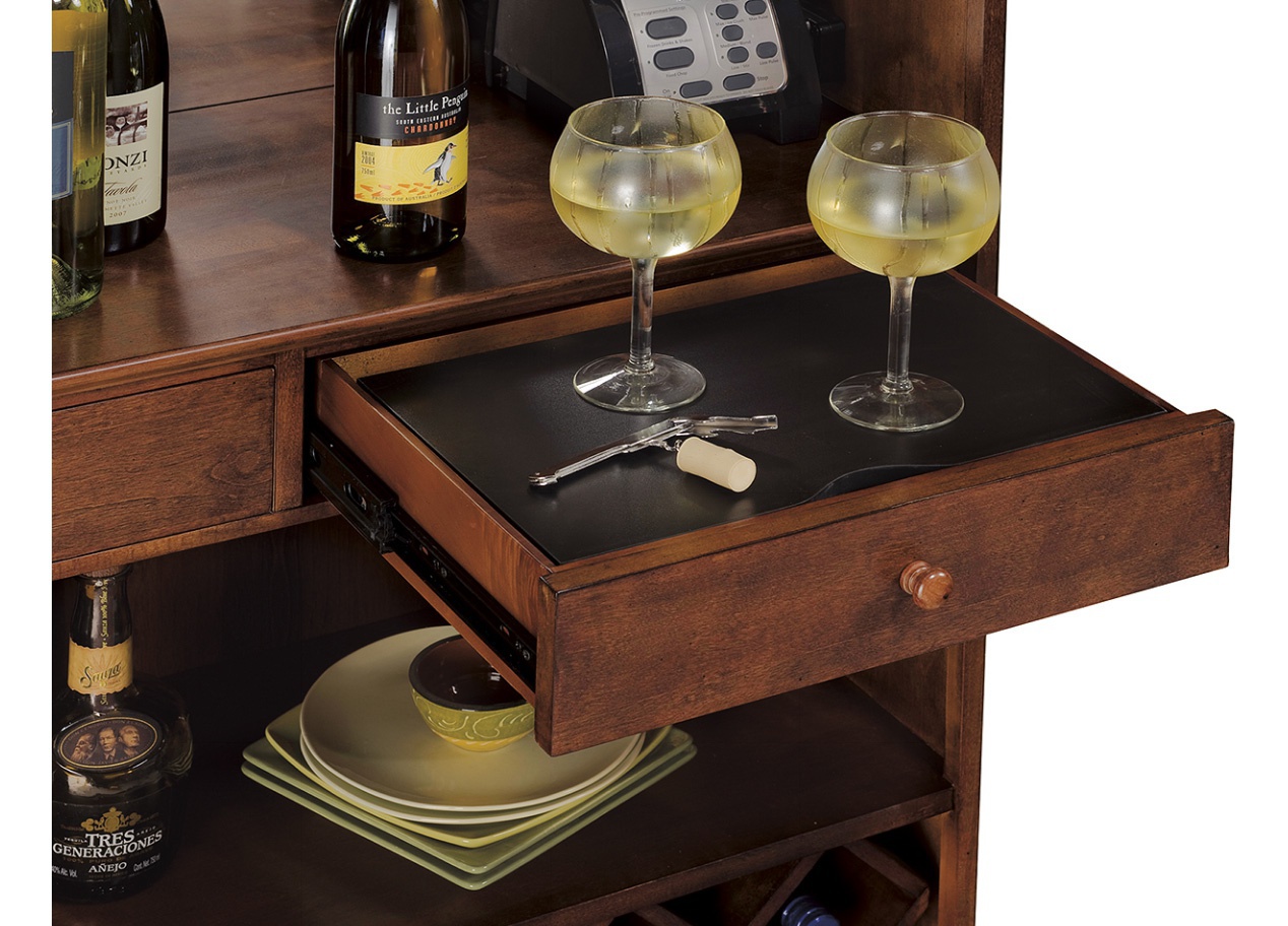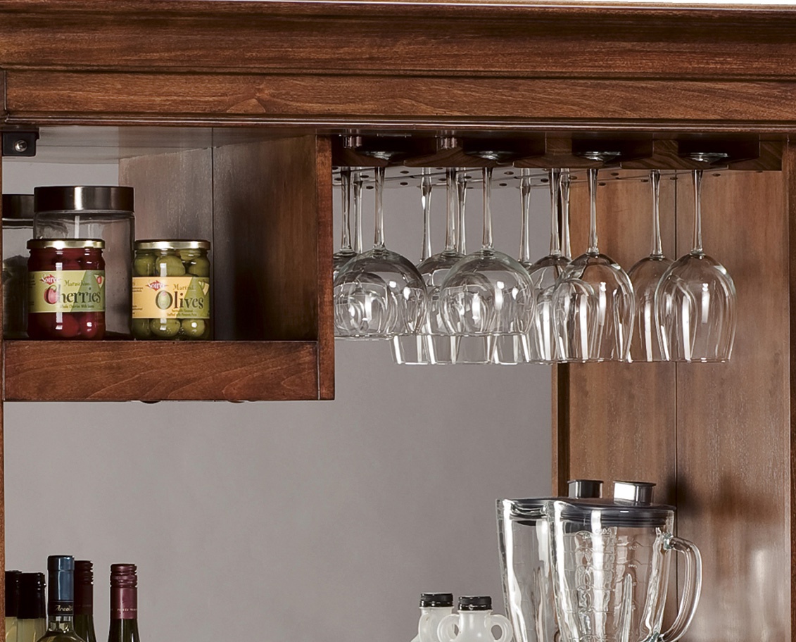 Cabinet bar and wine Barossa Valley from the American manufacturer Howard Miller. The body is made of wood or cherry hardwood and veneer. Model with hinged doors and shelves inside. The lower compartment has wine shelves with a capacity of 22 bottles. The upper part is equipped with a device for hanging wine glasses and drawers for storing Cutlery. English design in colonial style.