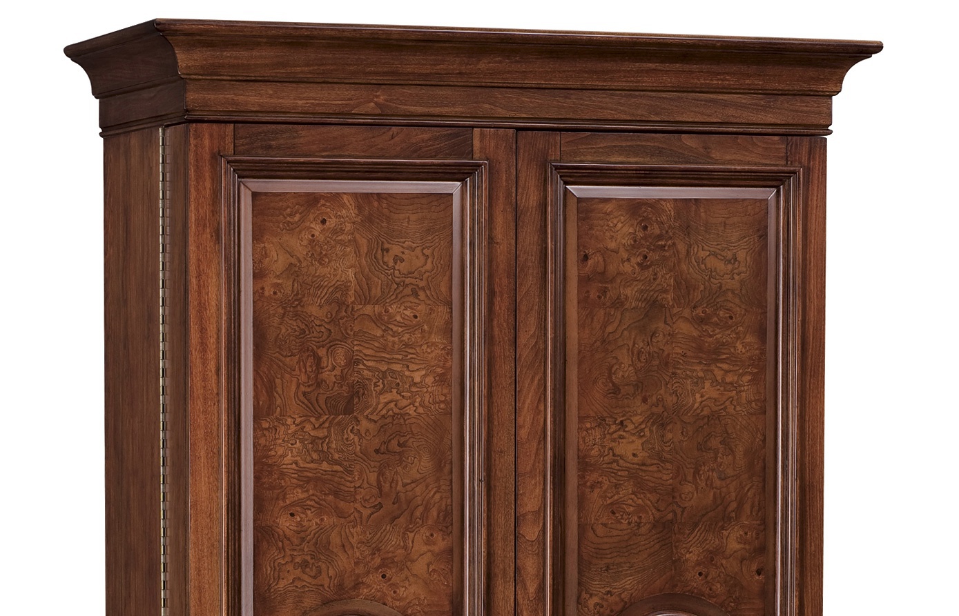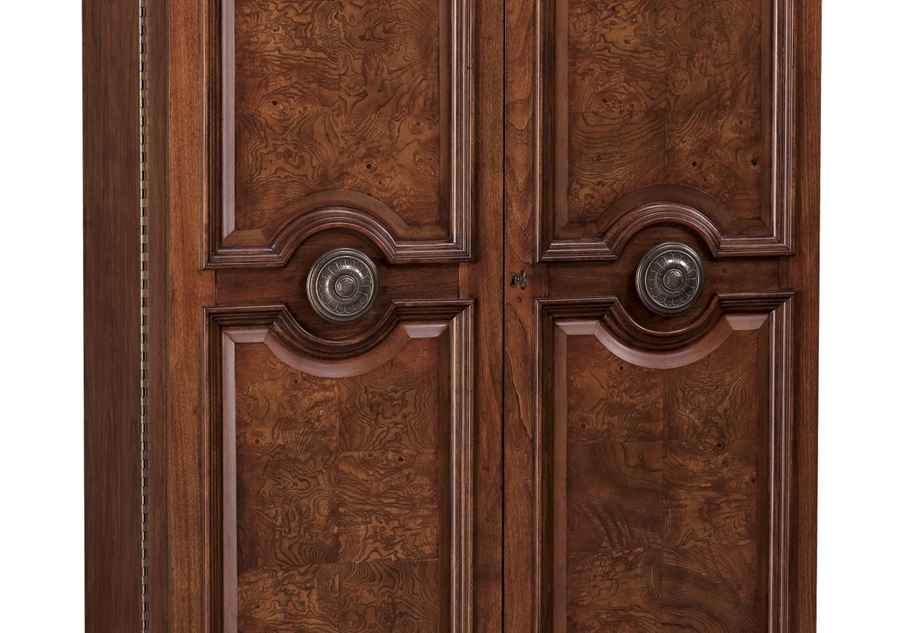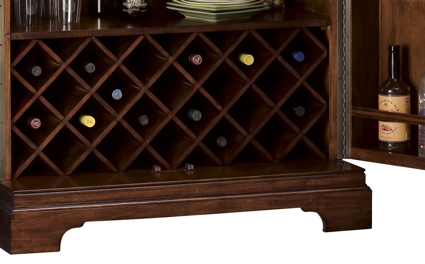 Cabinet bar and wine Barossa Valley from the American manufacturer Howard Miller. The body is made of wood or cherry hardwood and veneer. Model with hinged doors and shelves inside. The lower compartment has wine shelves with a capacity of 22 bottles. The upper part is equipped with a device for hanging wine glasses and drawers for storing Cutlery. English design in colonial style.