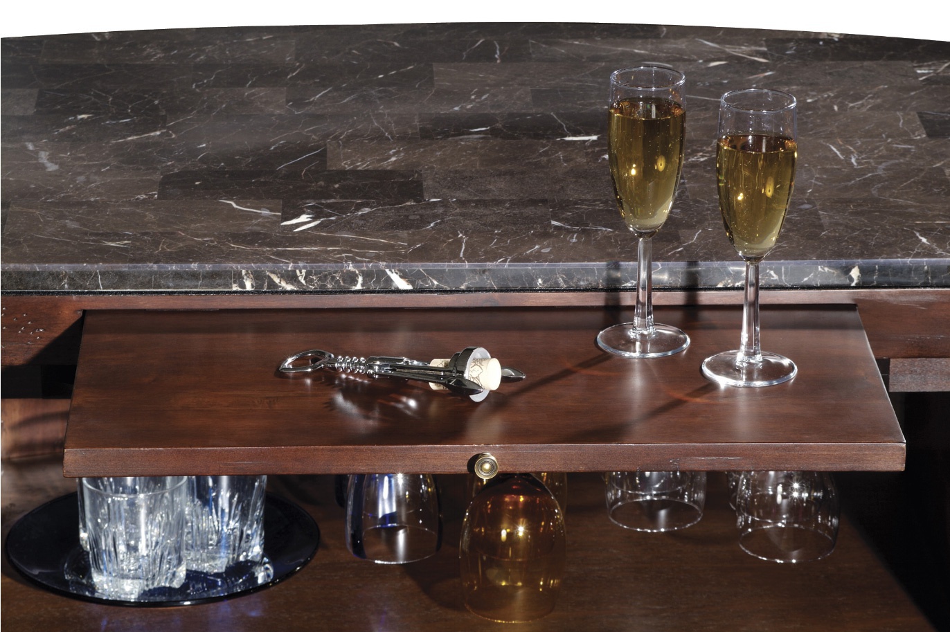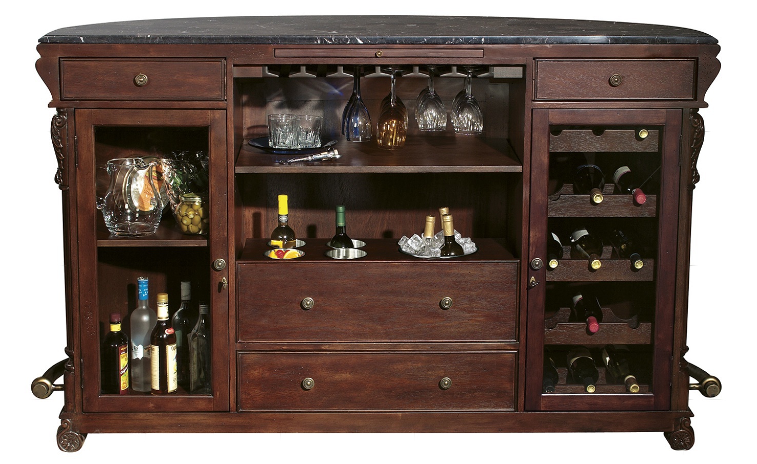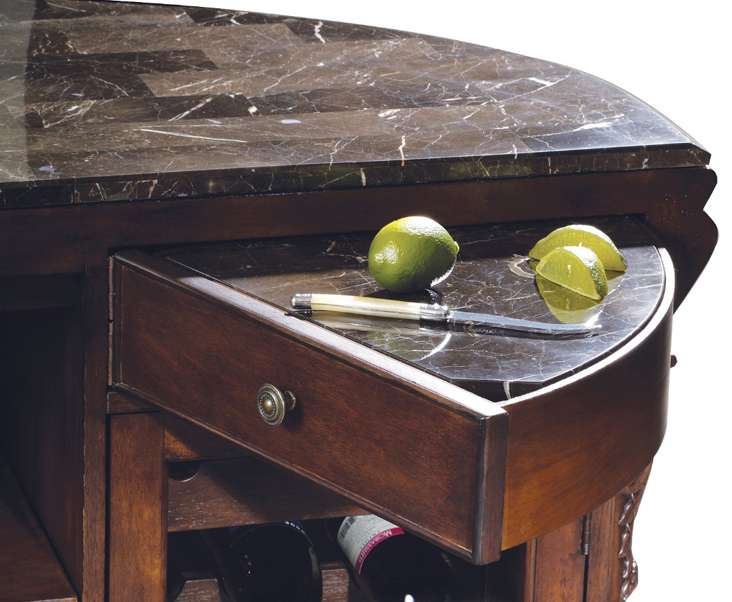 Bar Niagara from the American manufacturer Howard Miller. Body carved handmade from wood or cherry hardwood. Top of marble or granite. Semi-circular rack with drawers for storing Cutlery. Holder for wine glasses and storage bottles. Extendable tables -shelves. Model with adjustable glass and wooden shelves with lighting. Classic style. Colours in stock.