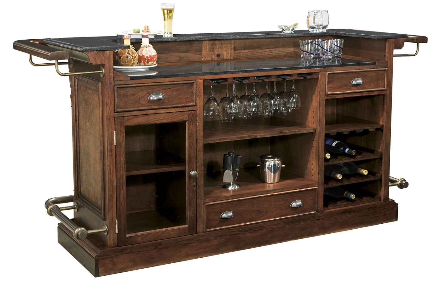Bar Cheers from the American manufacturer Howard Miller. Body carved handmade from wood of firm breeds. Top of granite. Hardware is metal with a metal holder for the legs. Stand with drawers for storing Cutlery. Holders for wine glasses and storage bottles. Model with adjustable glass and wooden shelves with lighting. Classic style. Colours in stock.