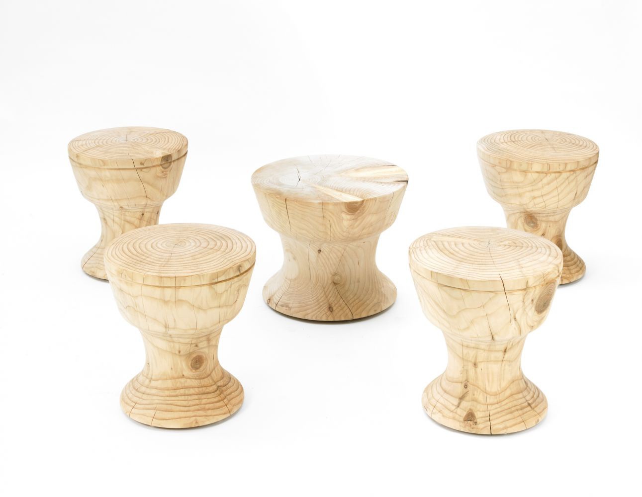 Poof Djembe Stool from the Italian manufacturer Riva 1920. Model with a round seat carved from a single trunk of cedar. The design is executed in modern style.