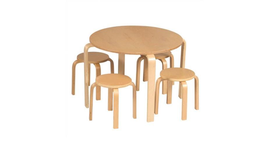 The table and stools Primary Natural from an American manufacturer DwellStudio. Set for the nursery consists of a round table and four round stools, made of birch plywood. Bent legs, natural wood color. This convenient kit is the perfect place for afternoon tea or crafts children's crafts.