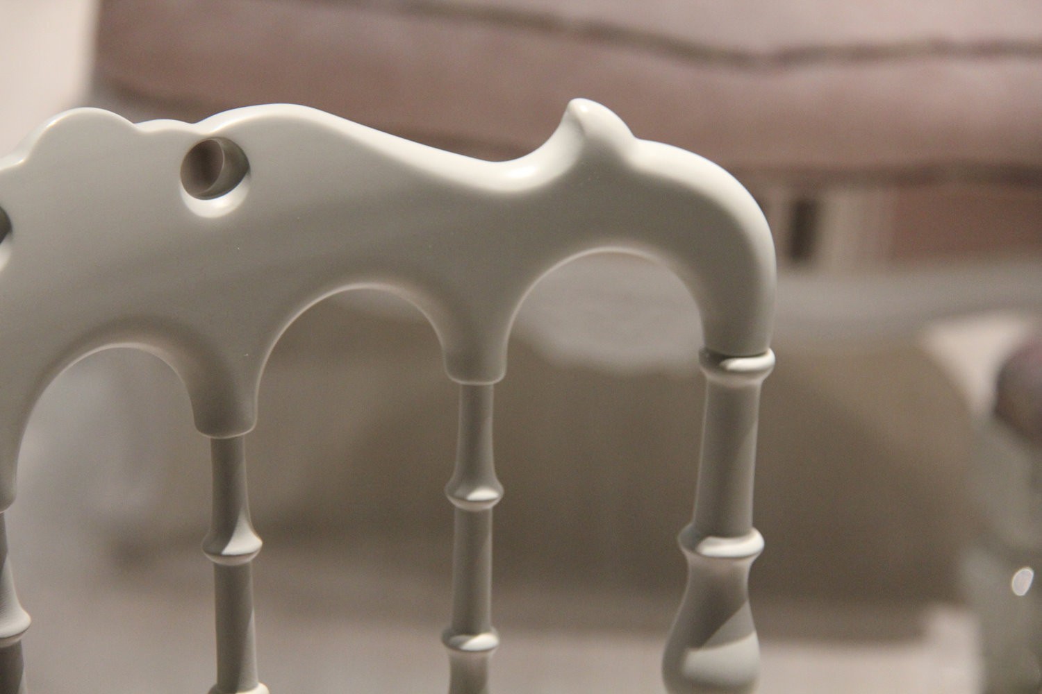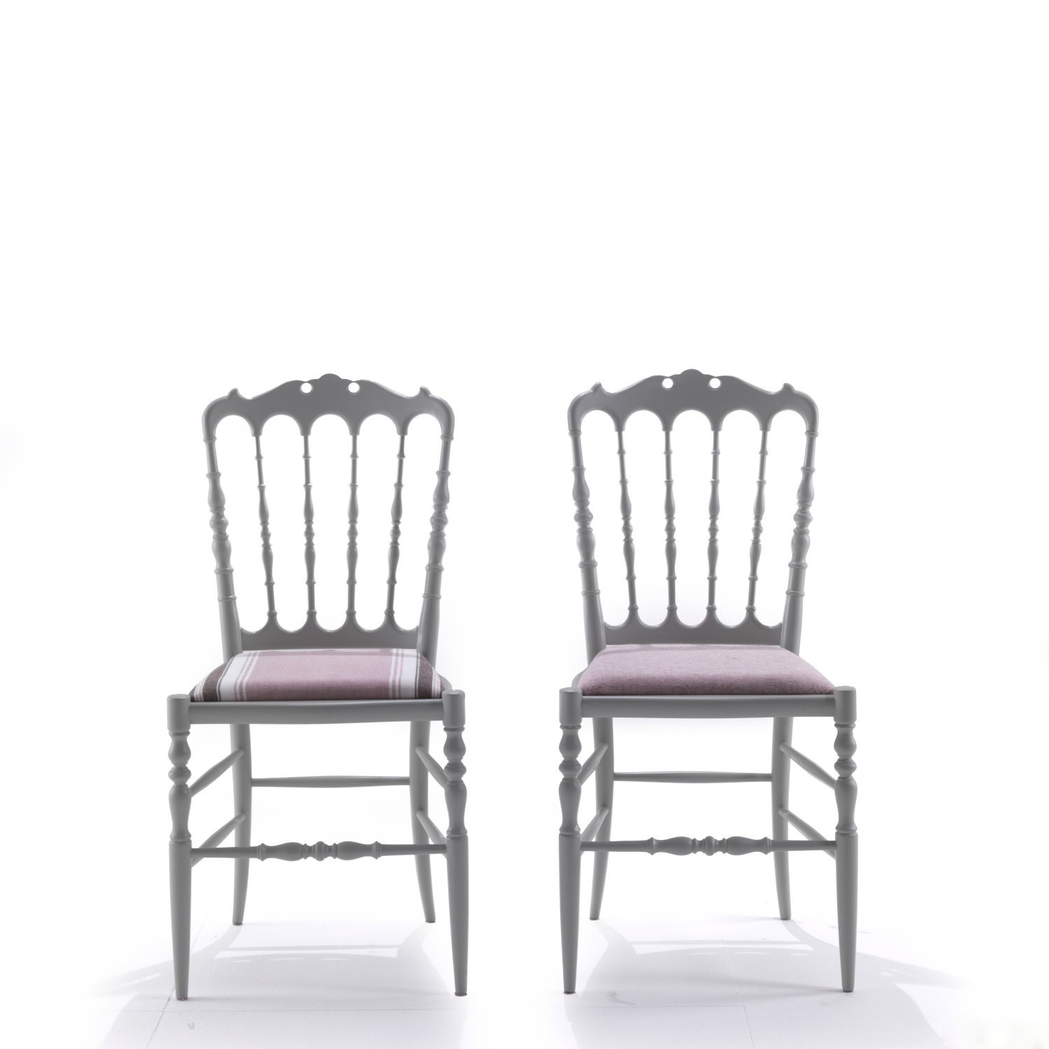Kadrega chair from the Italian manufacturer Moda. Hand-crafted furnishings, carved frame made of solid wood. Lacquer treatment, options. Upholstered seat in fabric, designer decor. Color catalog of the manufacturer, the model presented in white and dark wood. Chair for dining room in neo-Baroque style.