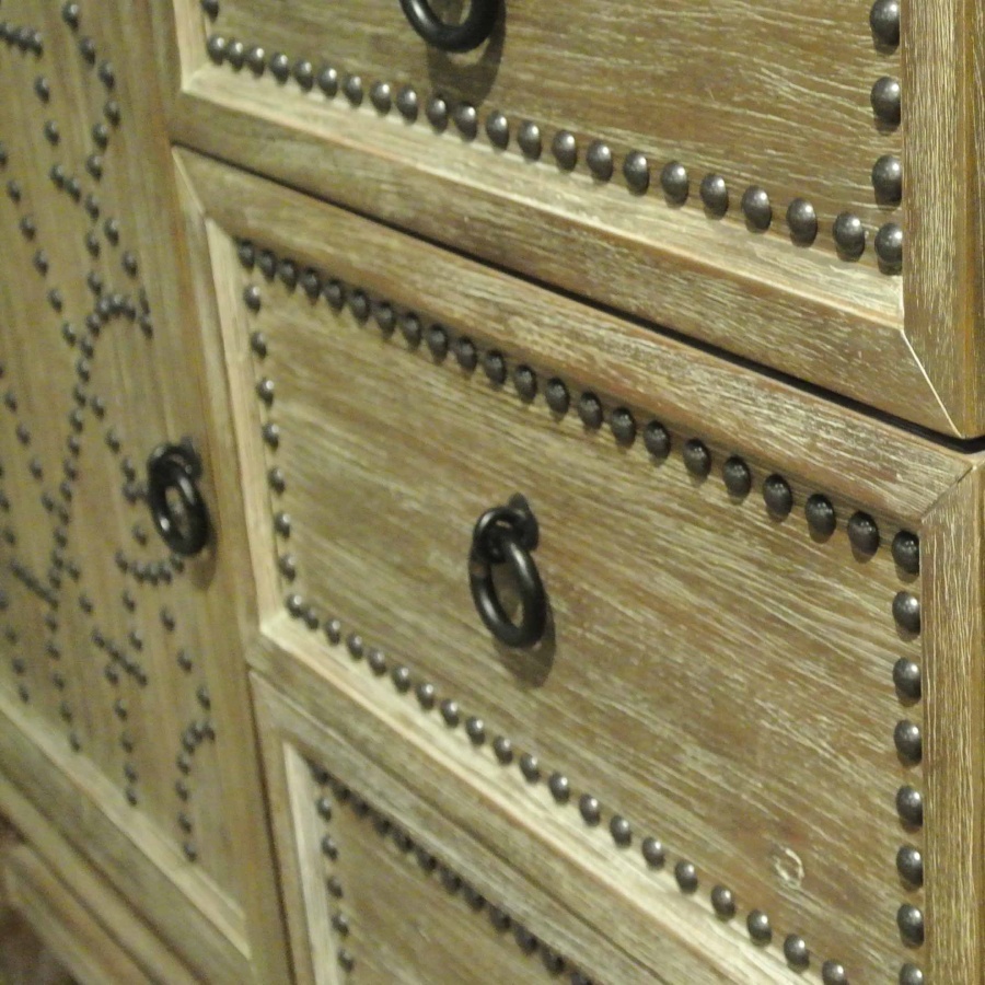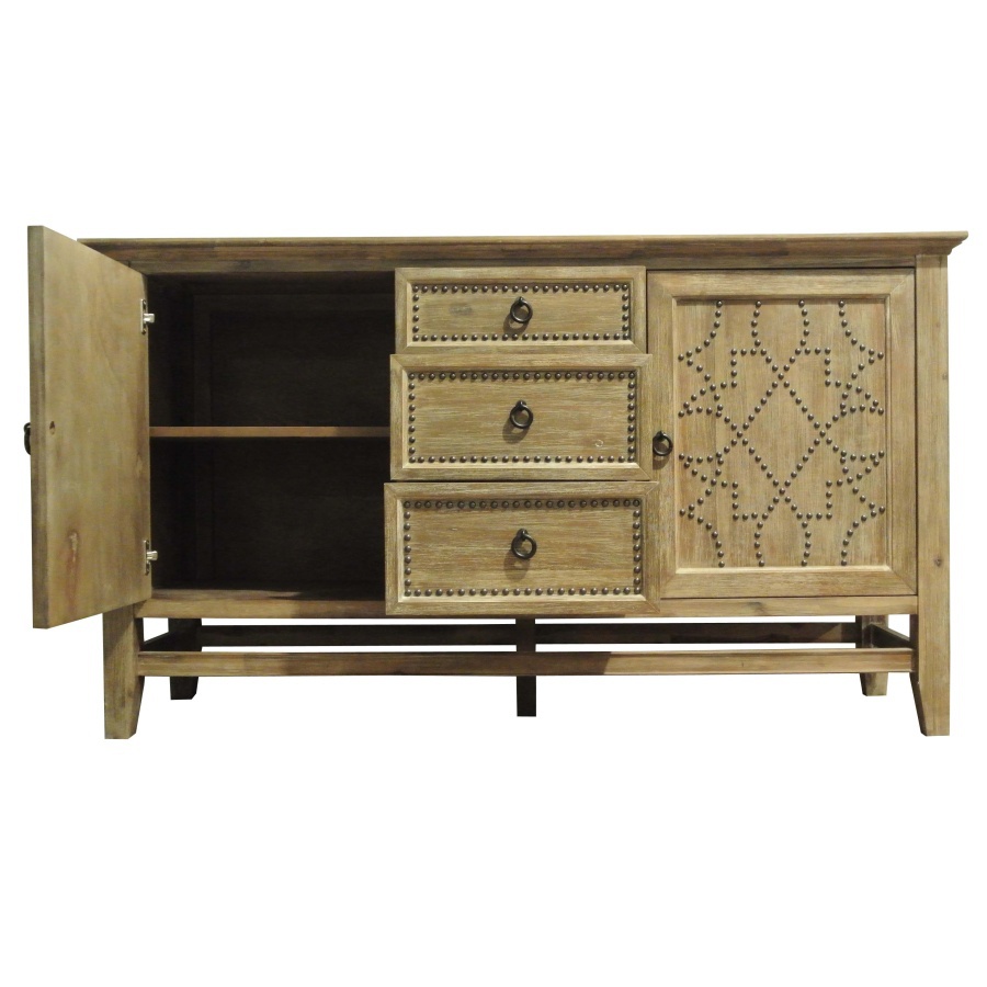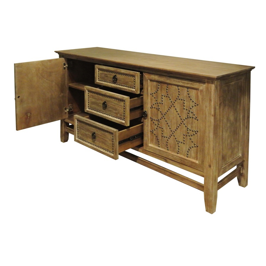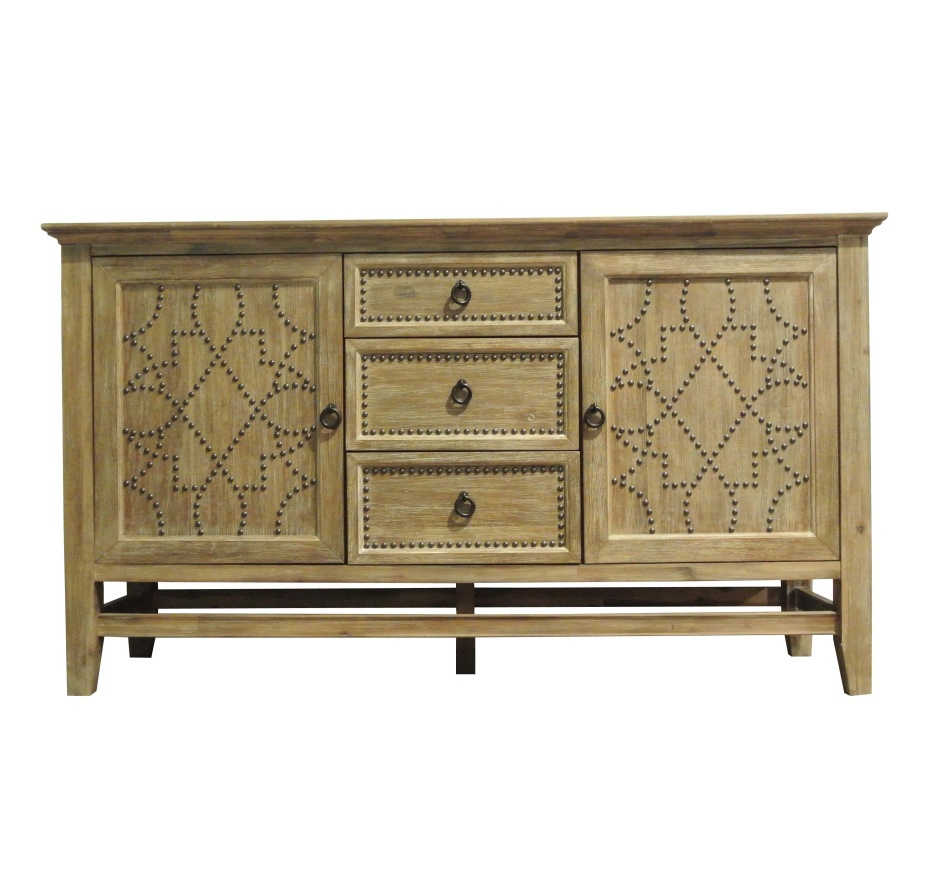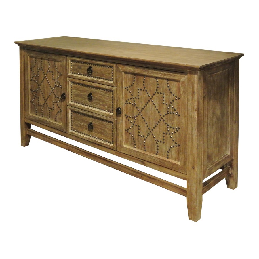 Braxton sideboard from the collection of Traditions from the American manufacturer Orient Express Furniture. This designer sideboard is made in Provence style, doors and drawers decorated with a pattern of antique brass studs. This small sideboard the Italians called the credenza. He is a Cabinet with hinged doors, inside which there are two compartments for dishes with adjustable shelves and three pull-out drawers of different sizes for silverware and linen. Frame, top and legs with a rectangular bar made of solid wood. The tree is processed under a rock and aged. Smooth sliding drawers provides the felt in the grooves. Due to its small size, buffet credenza can be used not only in the dining room but in any room that serves food and drinks. Combining fashion trends of furniture design with innovation in the field of component materials, the Orient Express Furniture company strives to achieve high quality and exclusivity of each product. Choosing the company's products Orient Express Furniture, You choose stylish and comfortable furniture.