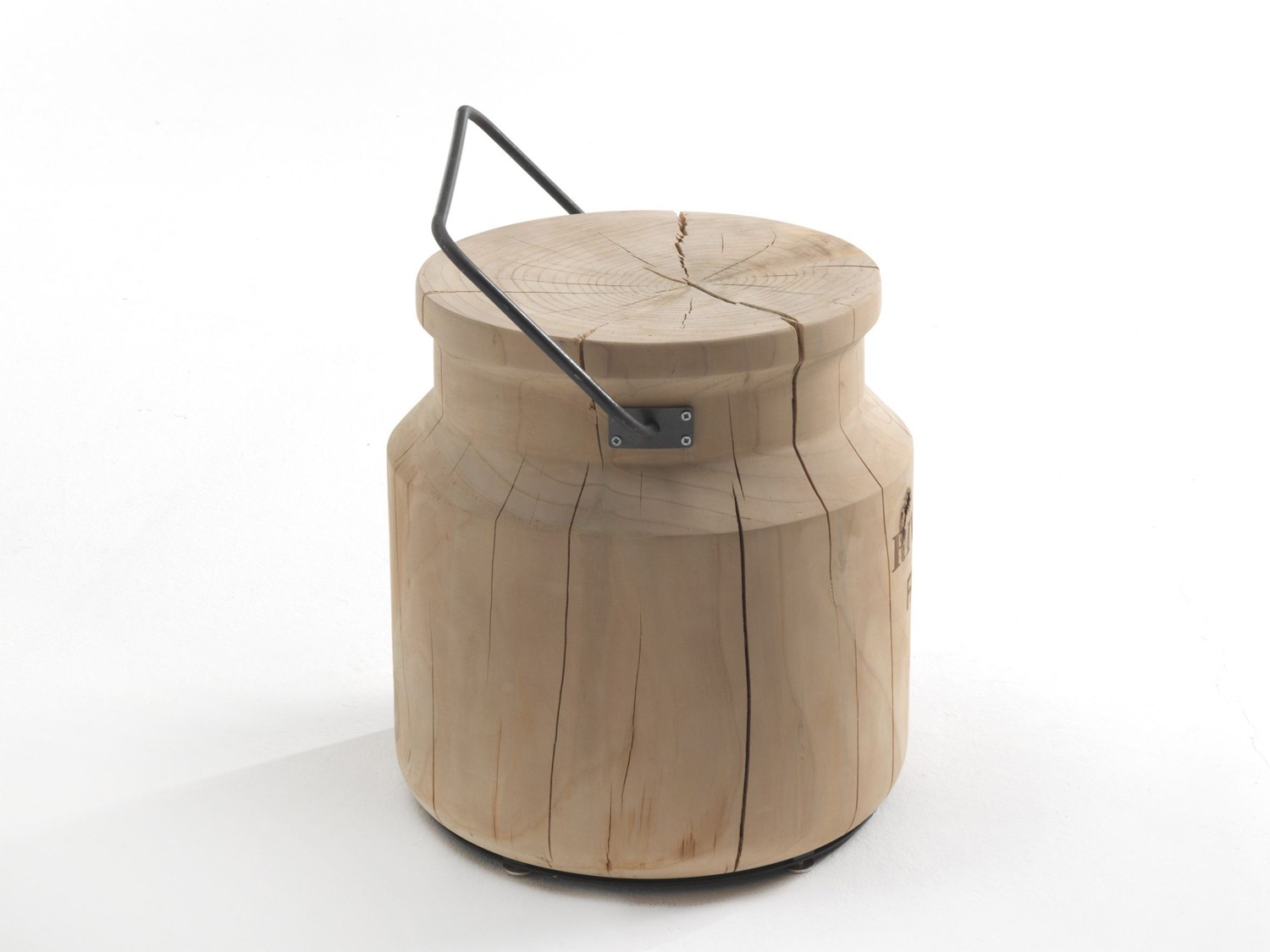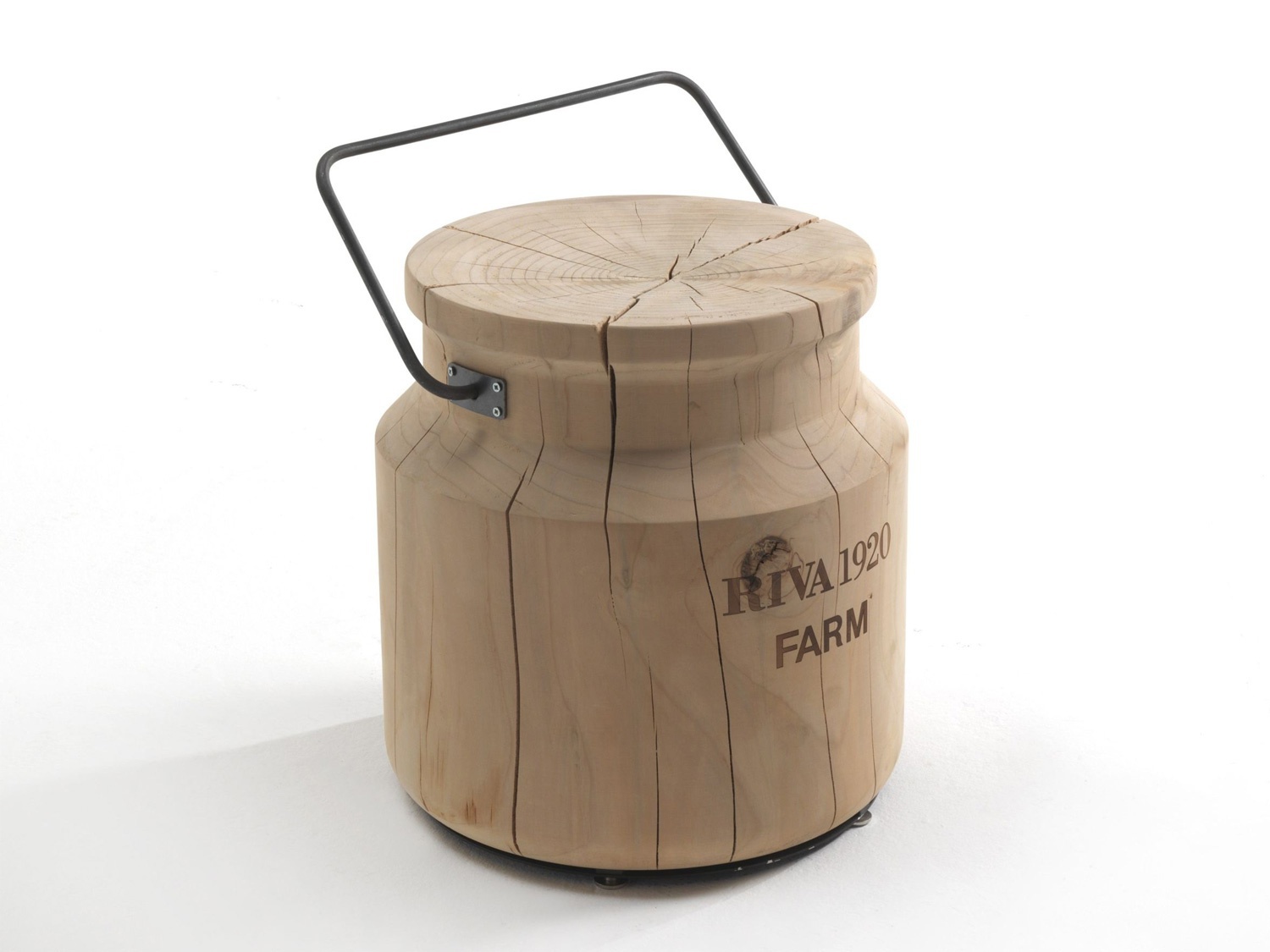 Secchiolatte stool from the Italian manufacturer Riva 1920. The body is carved from solid wood aromatic cedar. The model is made in the form of a container for milk. Decorative handle is made of metal.