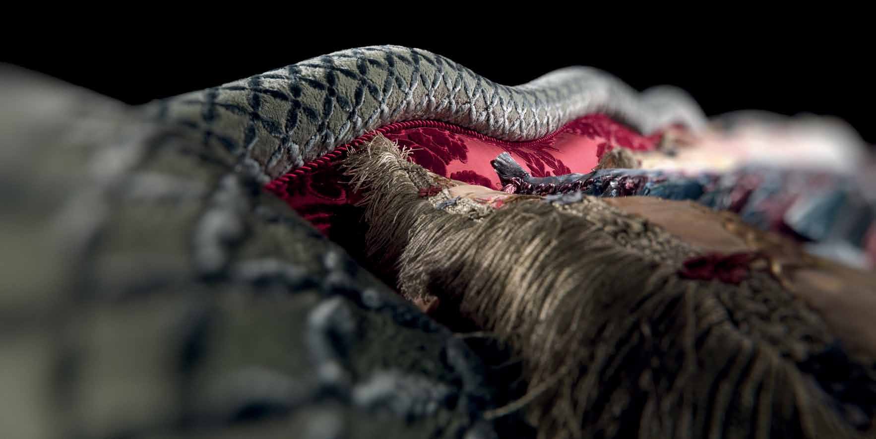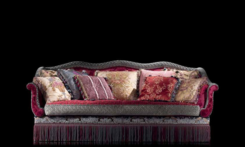 Three seater sofa from Italian manufacturer Jumbo Collection. The model is made in the Baroque style, collection Crystal. The frame is made from solid wood, filler - foam, upholstery - textiles from a range of campaigns. The design of complementary decorative pillows, fringes.