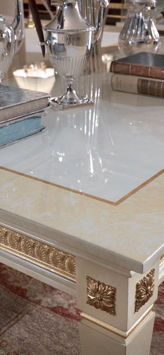 The Royale Arcade coffee table from the Italian manufacturer Turri. Wooden structure, hand decorated, gloss polyester finish ivory with a pattern of tree root and ochre effect tamponato.