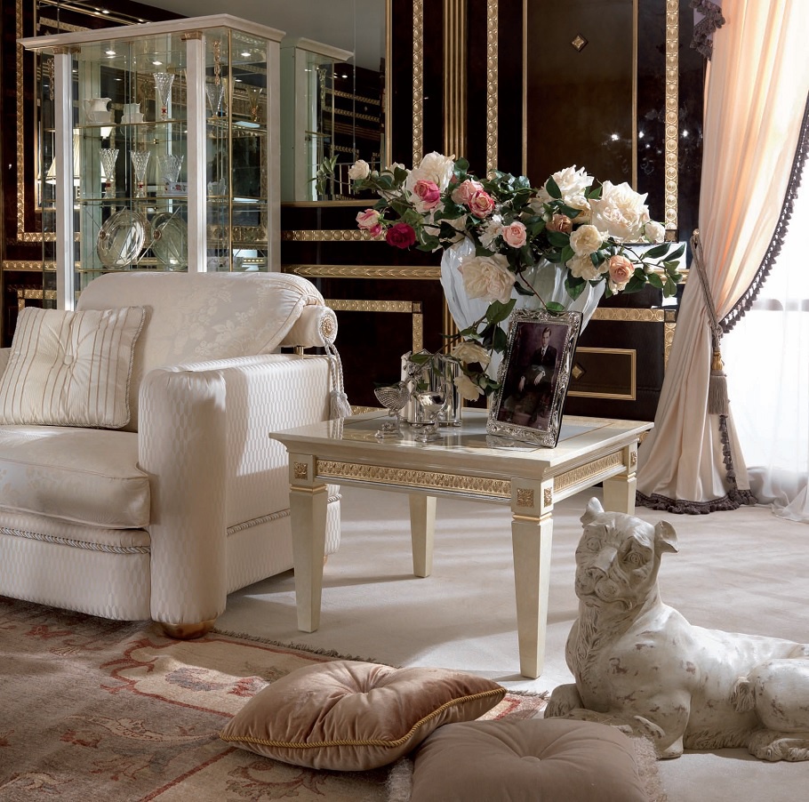 ПридиванныйArcade Royale square table from the Italian manufacturer Turri. Wooden structure, hand-decorated, gloss polyester finish ivory with a pattern of tree root and ochre tamponato effect.