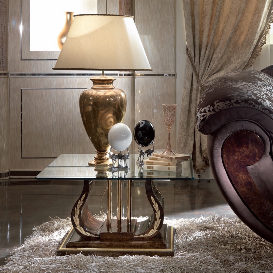 Pridivannogo table square Lira from the Italian manufacturer Turri. Wooden structure, hand decorated, gloss polyester finish brown. Decor brass parts are covered with gold leaf and artificially aged. The table top is made of glass, square, rounded corners, gives lightness to the product. The model is made in classic style, a perfect choice for a living room.