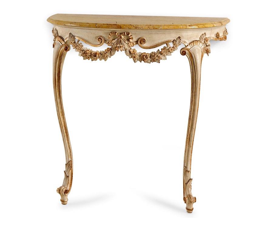 Console from the Italian producer Roberto Giovaninni. The frame is natural wood. Countertop - marble. Curved legs and an architrave decorated with handmade carving. Finish - gold foil, patina or artificial aging. The model is made in classic style, combines tradition and design. Colours in stock.