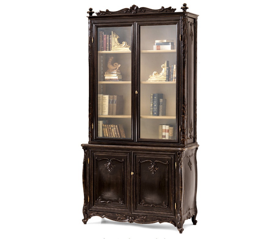 Showcase from Italian producer Roberto Giovaninni. Presents a model showcases with two doors, bottom part with wooden doors, with glass top. The frame is made from solid wood, the patina finish and ebony wood. Carved decorative elements are made manually. Inside finish bleached oak. Colors to choose from the catalog factory. The showcase will beautify your interior living room or library in the classical style.