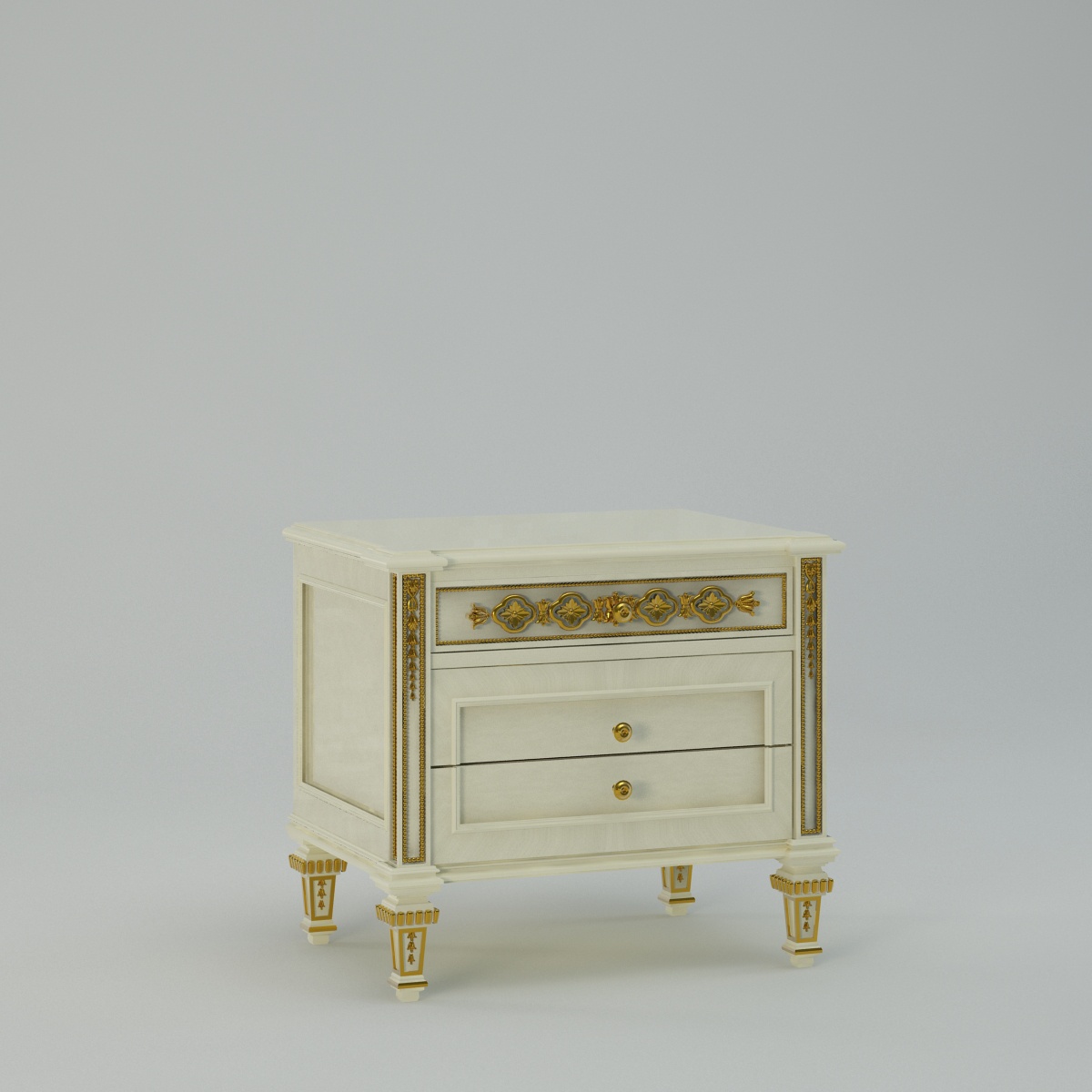 Tosca bedside table from the Italian manufacturer Turri. The product is made from wood. Decor handmade presents hand-carved, covered with gold leaf. The finish is a matte coated lacquer ivory. Product in a classic style is perfect for traditional bedrooms.