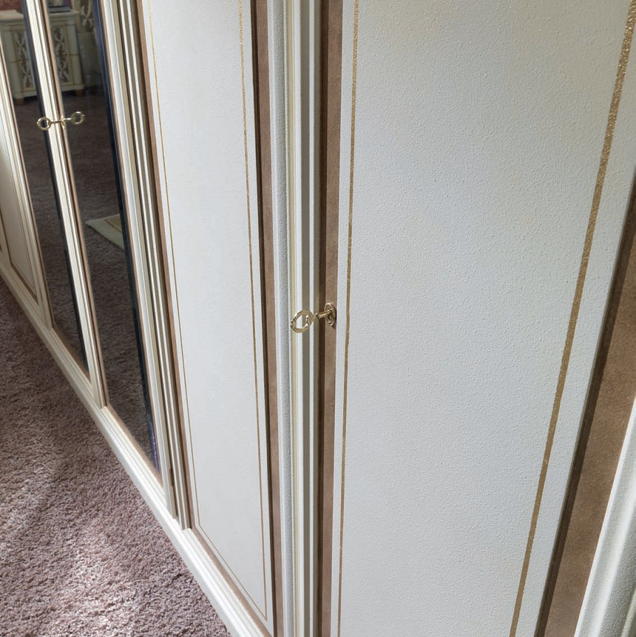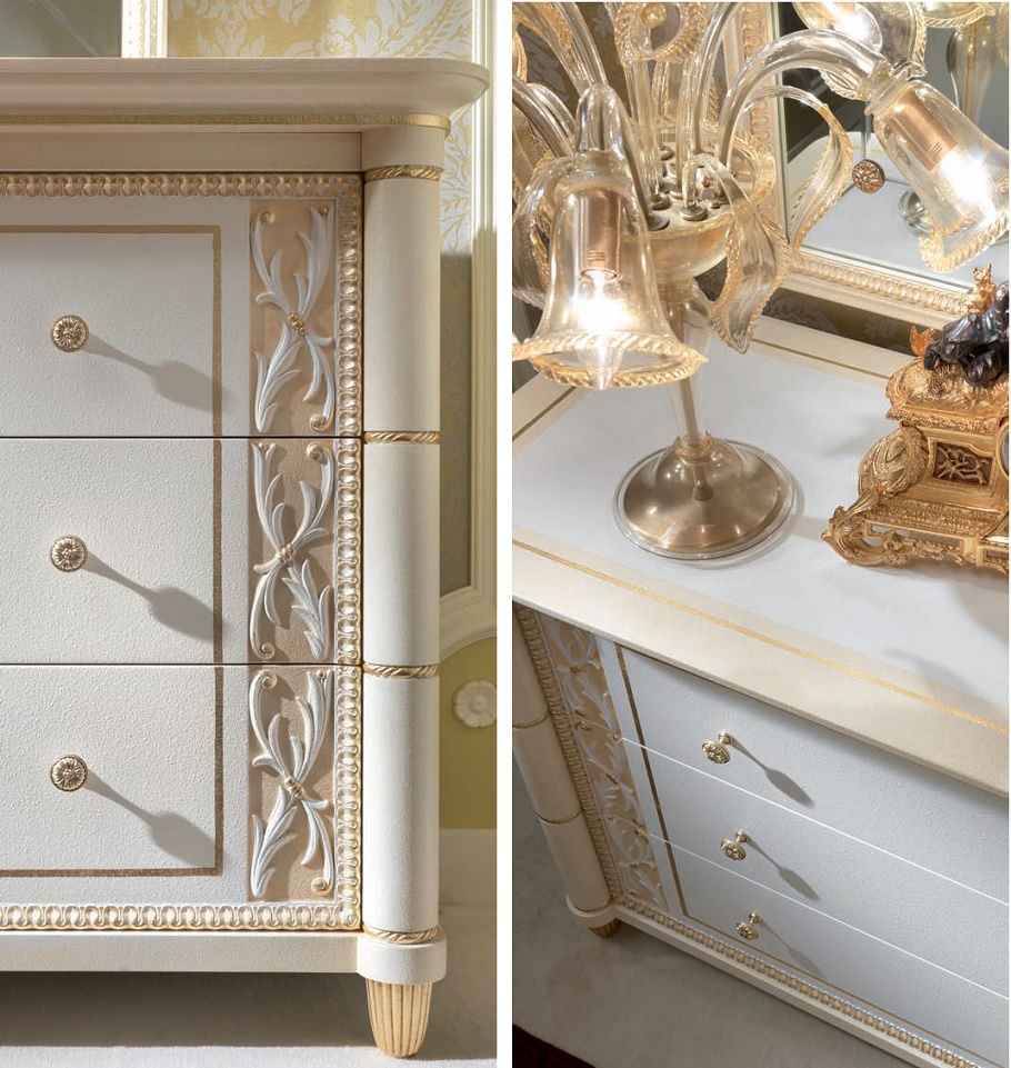 Set for bedroom Hary from the Italian manufacturer Turri. This set includes: double bed, dressing table with 4 drawers, mirror, stool, bedside Cabinet, chest of 3 drawers, wardrobe. The products are made of solid wood with decoration in the form of thread, handmade. Finish - matte salmon color with gilding. Set in a classic style for an elegant refined taste.