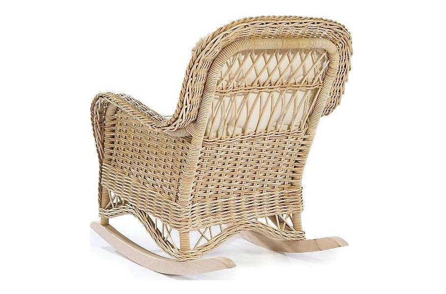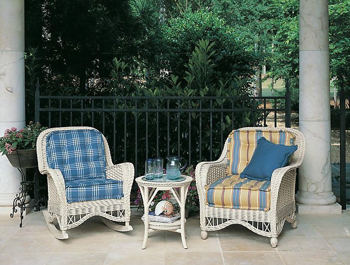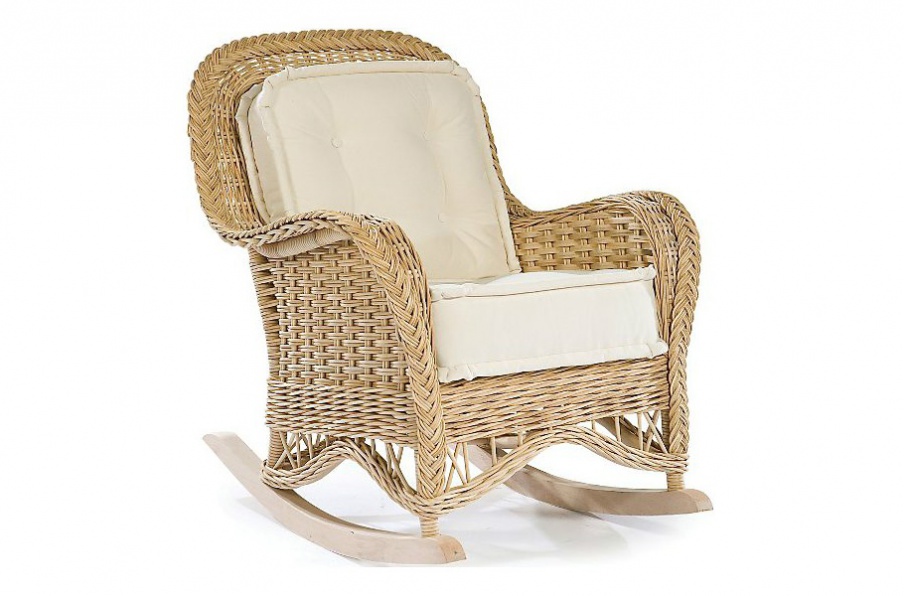 Rocking chair Rocker Natchez from the American manufacturer Lane Venture. Made of woven rattan. Frame made of hard wood and metal. Model with wide armrests and removable cushions seat and back. The cover is made of waterproof fabric. Colors in the catalog range from the manufacturer. Designed for summer and outdoor furniture.