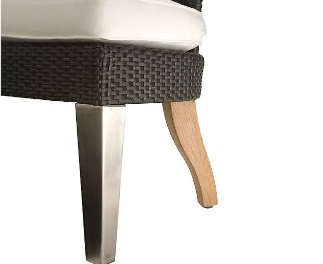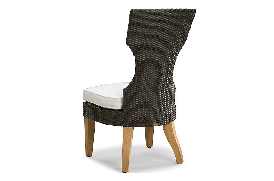 The Spinnaker chair High Back Dining from an American manufacturer Lane Venture. Model with a high back designed for summer furniture. The frame is made of hardwood with carved legs. The body is woven from rattan. Seat with padded cushion with waterproof padding. Colors in the catalog range from the manufacturer. The modern design.