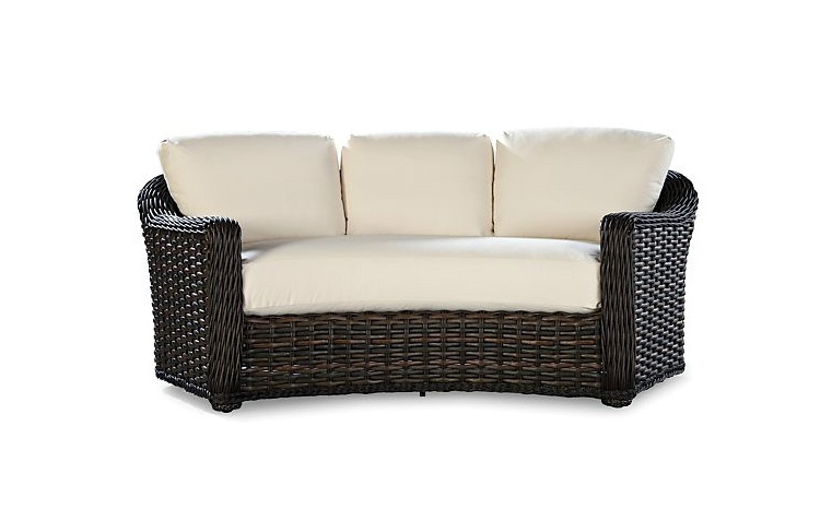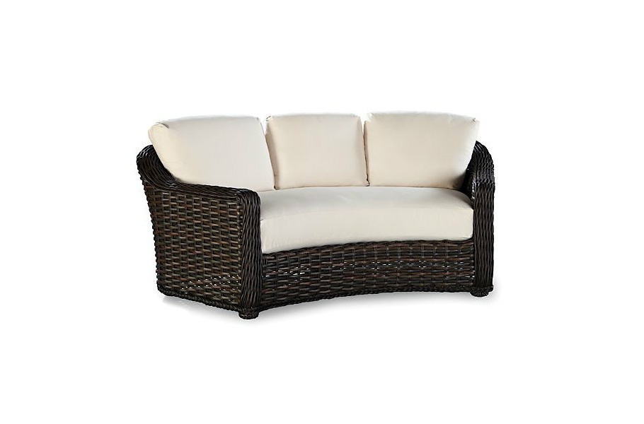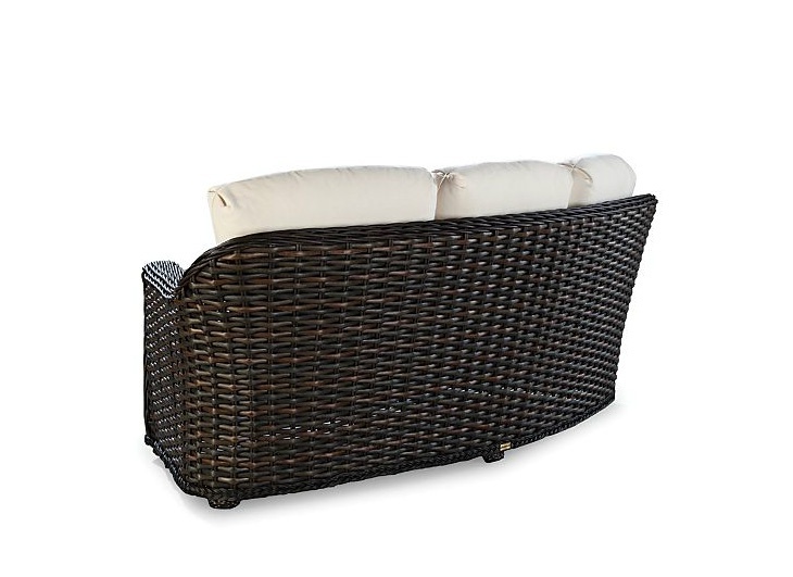 The South Hampton sofa semi circular Curved from the American manufacturer Lane Venture. Made of woven rattan. Frame made of hard wood. The model with armrests and a detachable seat, is supplemented with decorative pillows. Designed for summer and outdoor furniture. Colors in the catalog range from the manufacturer. The modern design.