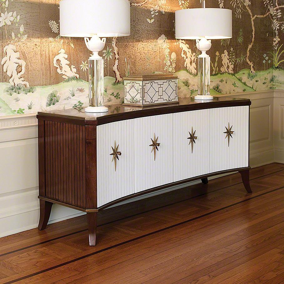 The Klismos Cabinet Desk from an American manufacturer Global Views. The designer has embodied in this sophisticated style Cabinet Regency. Beautiful finishes and thoughtful details make it worthy of a Cabinet Minister. Frame, doors and carved tapered legs made of walnut, the exterior of which is retained on the sidewalls, top and bottom cabinets trimmed in gold, front profile concave. There are four swing doors lacquered ivory, behind which there are two wide compartments with adjustable shelves from wood. If desired, the Cabinet can serve as a stand for TV, audio or video, which is now increasingly included in the set of office furniture back wall of the pedestal has openings for media component wiring. Brass fittings, made in the form of eight-pointed stars with the reverse disk. Global Views when creating their collections of furniture and accessories uses both the experience of older European couture houses such as Chanel, Balenciaga and Hermes and fresh ideas of modern designers. Colorful, multi-layered collection are a refreshing blend of Antiques and the sense of modernity.