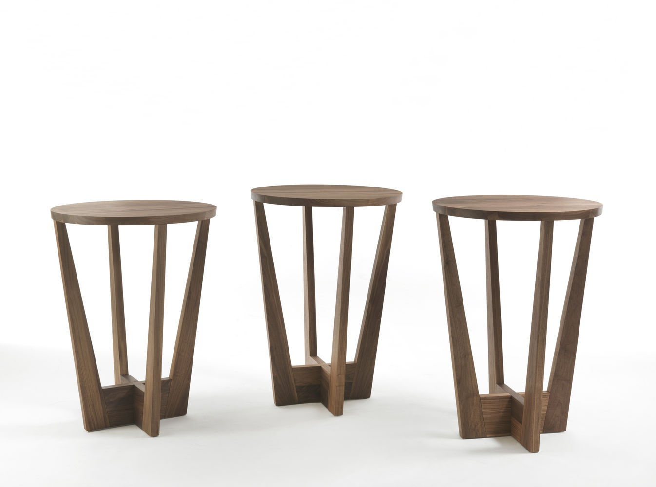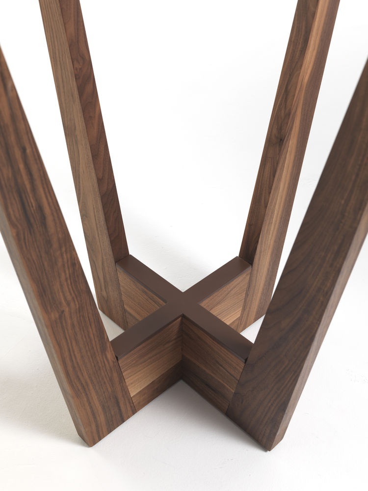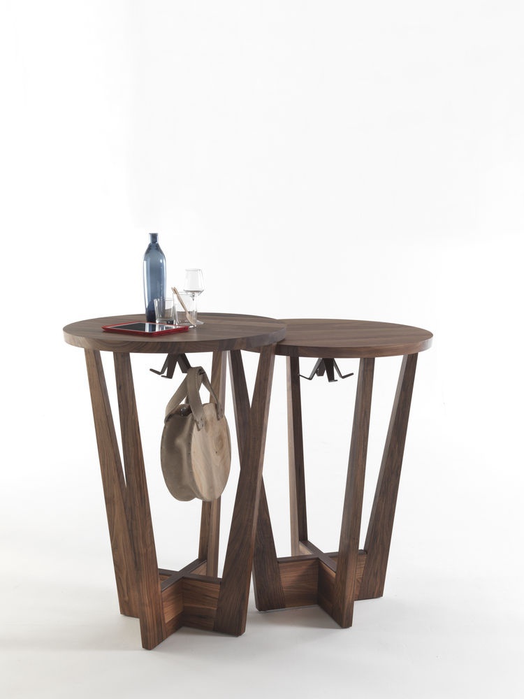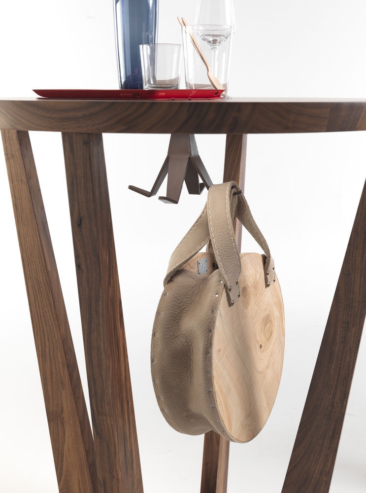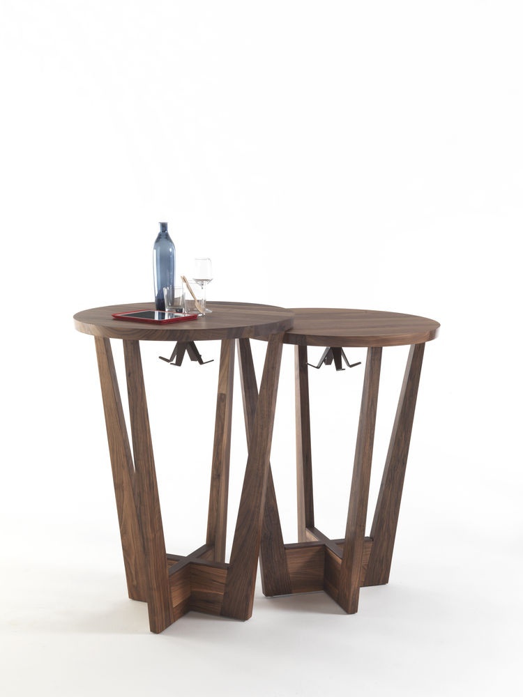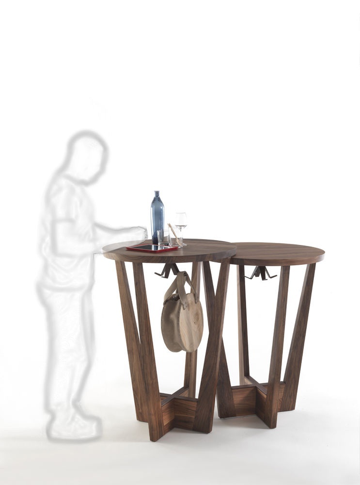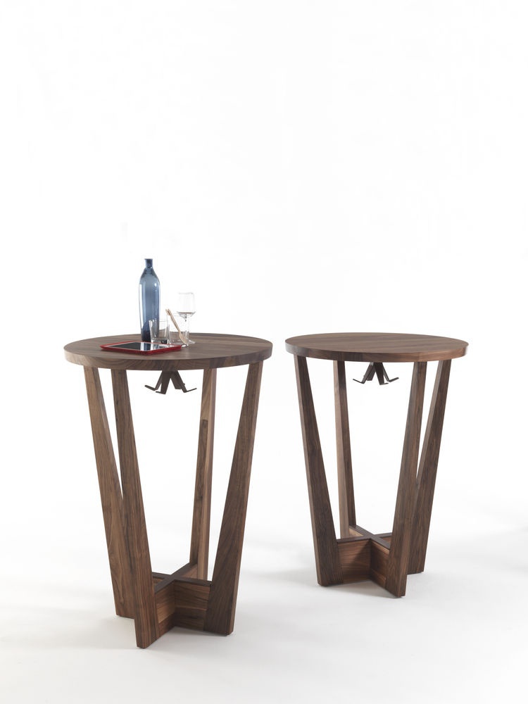 Table Parla from the Italian manufacturer Riva 1920. This elegant bar table with round top available in two heights and two types of wood. The model is made entirely of wood. Metal footrest is covered with bronze finish.