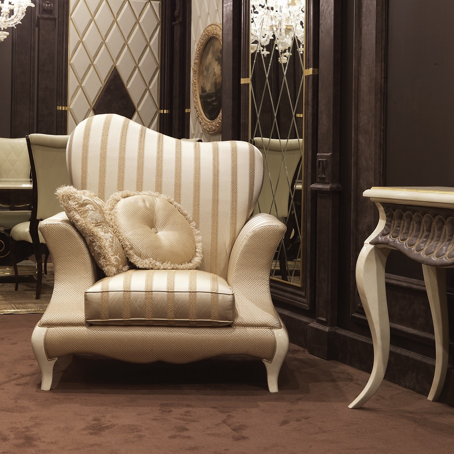 The Versailles chair from the Italian manufacturer Turri. The frame is made from solid wood. Upholstery - textiles from the catalog company. Filler - polyurethane foam. Colors - ivory, beige. The chair is upholstered in a classic style. Smooth lines give the ease and comfort of the product. The chair is in Seating set collection, Versailles, a great way to elevate living room.
