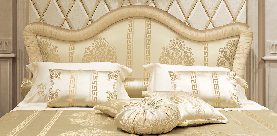 The Versailles double bed from Italian manufacturer Turri. Bed made of solid wood. Upholstery - textiles from the company portfolio. Filler - polyurethane foam. Bed with high upholstered headboard, decorated with buttons stitch-Capito. Legs are figured, treated with glossy lacquer brown. The bed is made in a classic style, a perfect choice for a large bedroom. Bed included in bedroom set collection Versailles.
