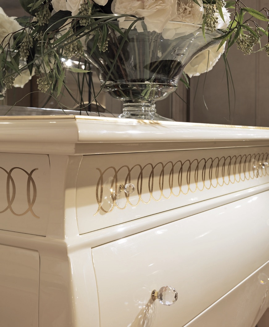 The Versailles chest of drawers from Italian manufacturer Turri. The product is made of solid wood. Surface treated high gloss lacquer finish in ivory. The decor speaks of Golden engraving at the base of the tabletop. The soft curves of the product, characteristic of classic design and add elegance. Dresser with 2 drawers included in the bedroom set of the collection Versailles.