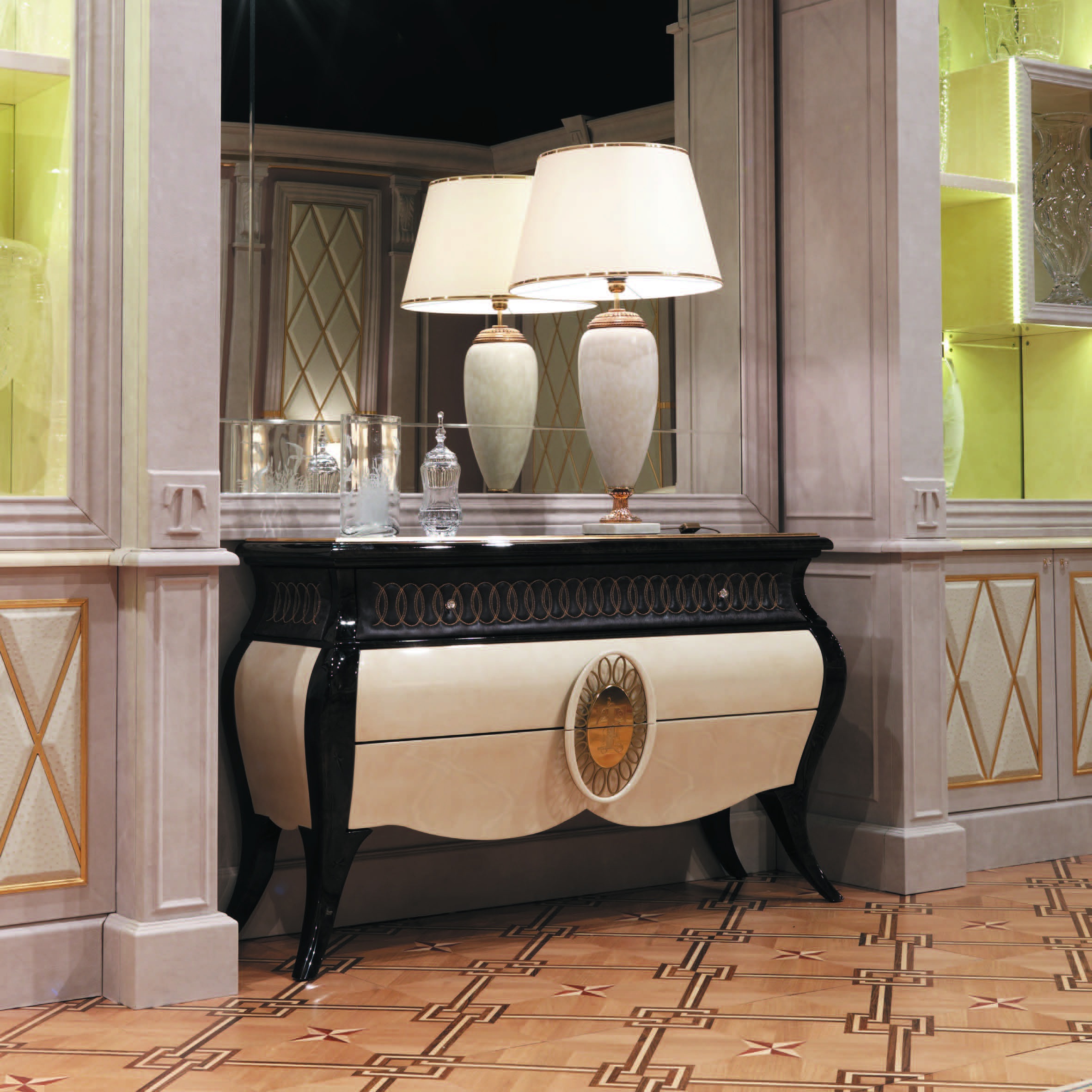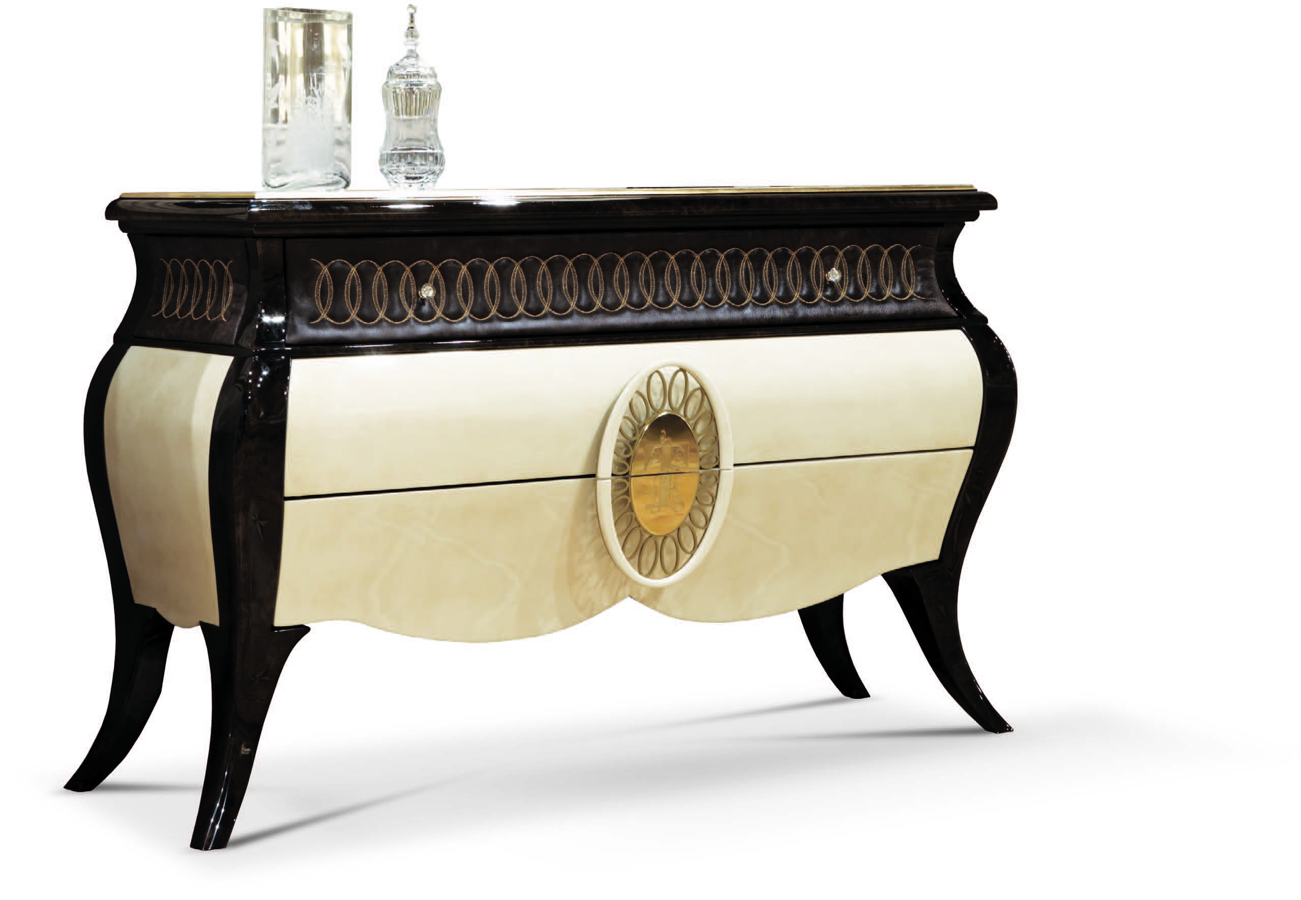 The Versailles chest of drawers from Italian manufacturer Turri. The product is made of solid wood. Surface treated high gloss lacquer finish in ivory and brown. The decor acts as a Golden inlay on the front panel, and also leather applique handmade at the base of the tabletop. The smooth form of the product, characteristic of classic design and give the chest lightness and elegance. Dresser with 2 drawers included in the bedroom set of the collection Versailles.