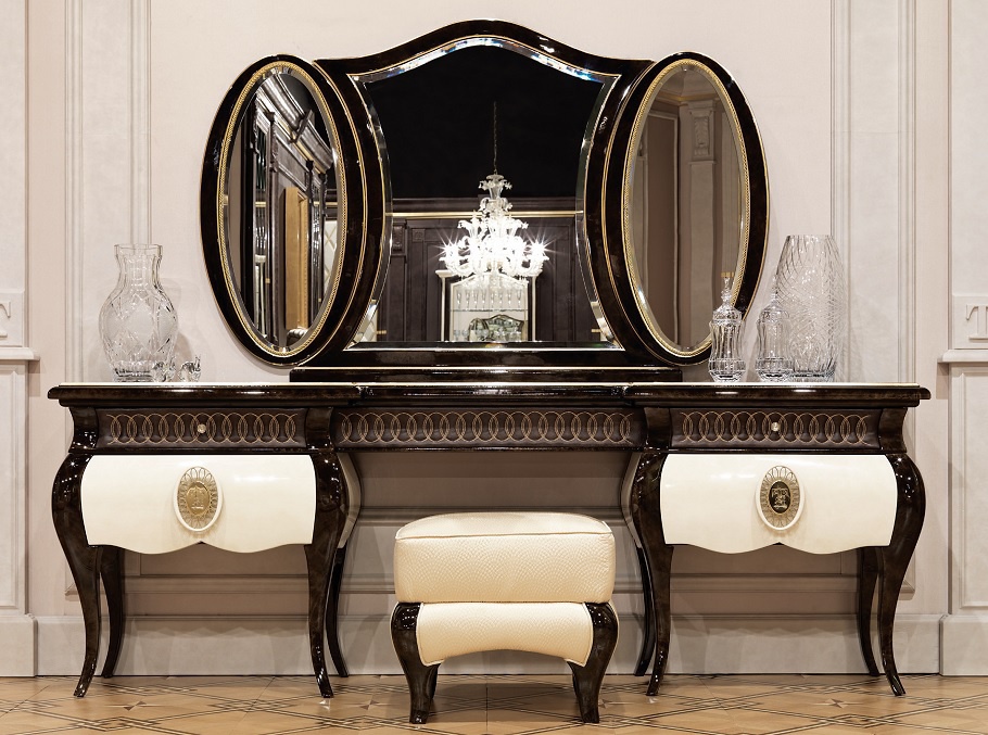 Versailles stool from the Italian manufacturer Turri. Frame, legs made of solid wood. Surface of legs covered with a glossy varnish. Upholstery - leather. Filler - polyurethane foam. Colors - ivory, brown. Poof perfectly complement the dressing table from this collection. Model classic, is the bedroom set of the collection Versailles.
