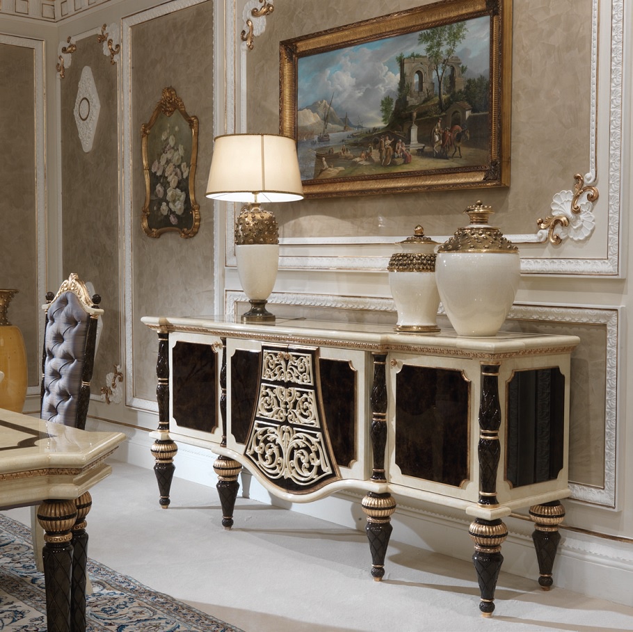 Set for the dining room Bovary from the Italian manufacturer Turri. Includes dining table, chairs with or without armrests, sideboard 4-door and window glass. Frames models made of solid wood. The varnish finish offered in the following colors: ivory, black, gold. The textile upholstery of chairs from the company portfolio. Shutters and shelves display cases - glass. Decor headset is hand carved, covered in gold leaf. Set is made in the art Nouveau style, a great choice for the dining room.