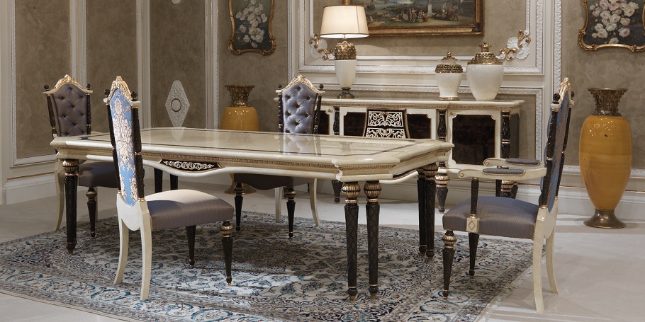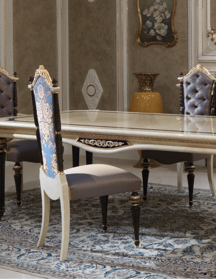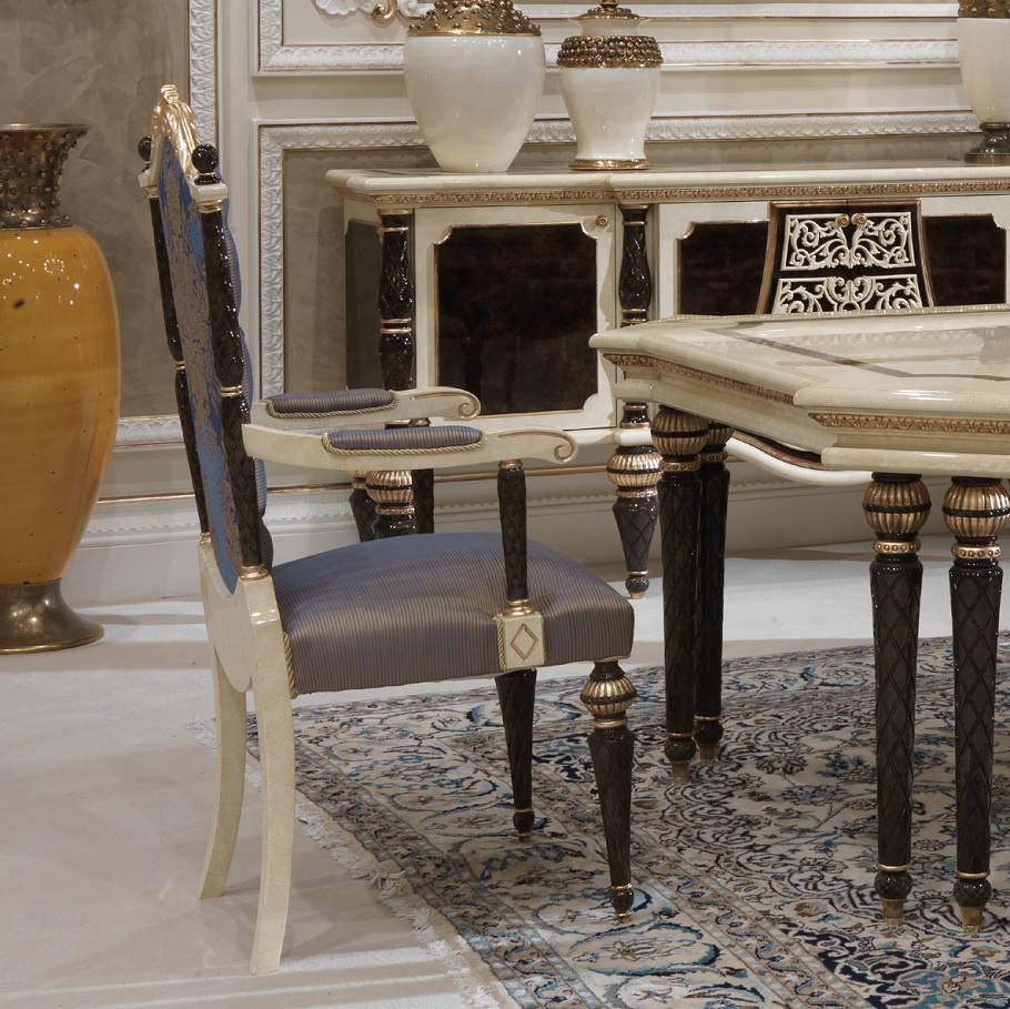 Bovary chair from the Italian manufacturer Turri. The manufacturer offers a choice of 2 types, with or without armrests. Frame, legs made of solid wood. The finish offers a glossy varnish. Colors: ivory, black, gold. Decor products, hand-carved, covered with gold leaf. The chair is in the dining sets collections Bovary.