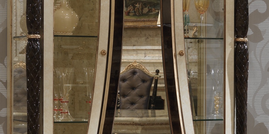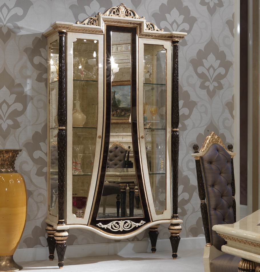 Showcase Bovary from the Italian manufacturer Turri. Frame, legs made of solid wood. Shutters, shelves - tempered glass. Surface treatment - lacquer. Color palette: ivory, black, gold. The decor was hand carved, covered by a Golden lacquer. Showcase in classical style - a perfect choice for a dining room. The product comes in dining sets collection Bovary.