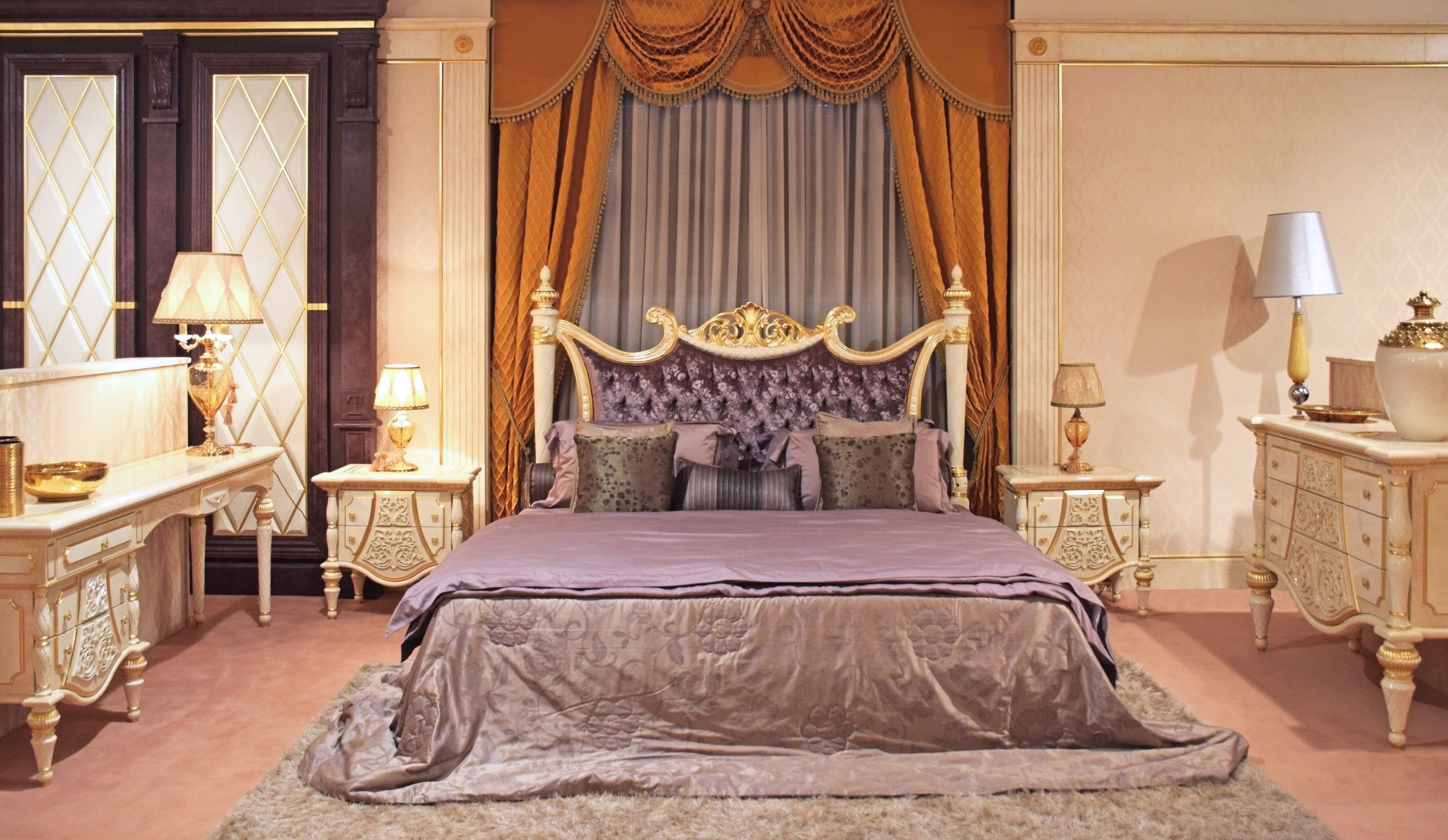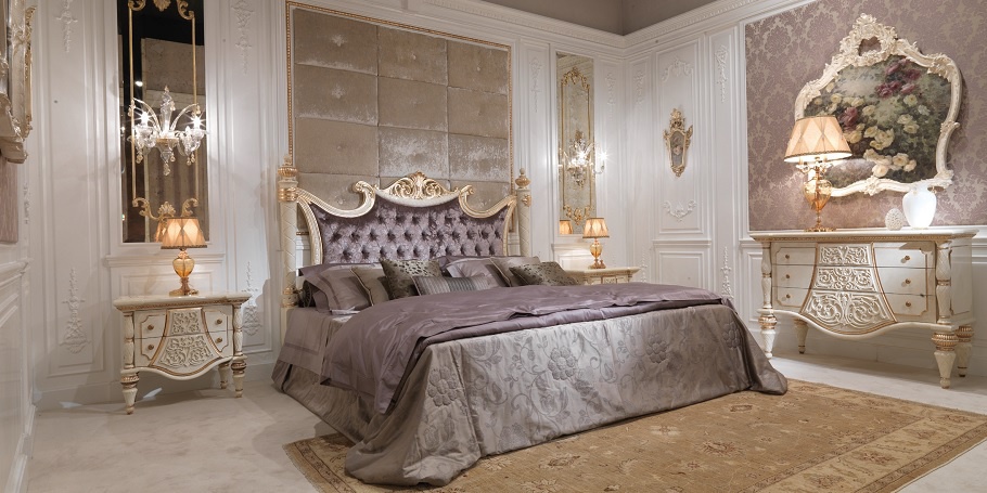 Set for bedroom Bovary from the Italian manufacturer Turri. This set includes: double bed, chest of drawers, bedside table, dressing table. Frame each item is made from wood. The soft upholstery of the headboard and of the bed - textiles from the company portfolio. Filler - polyurethane foam. A wooden surface is varnished in ivory. The decor, in the form of deaf relief carving hand carved and covered with gold leaf. Set is made in the elegant, bright style, great for a large bedroom.