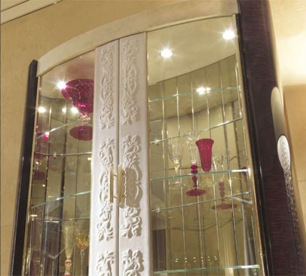 Double showcase Couture collection from Italian manufacturer Turri. The frame is made from solid wood. Shutters, shelves from tempered glass. Accessories metal chrome. The surface finish of polyester. Colors: dark brown, white, ivory, Golden. The decor is a floral design on the doors. The product of modern design, strict. Fit perfectly into the sleek interior of living room, dining room.
