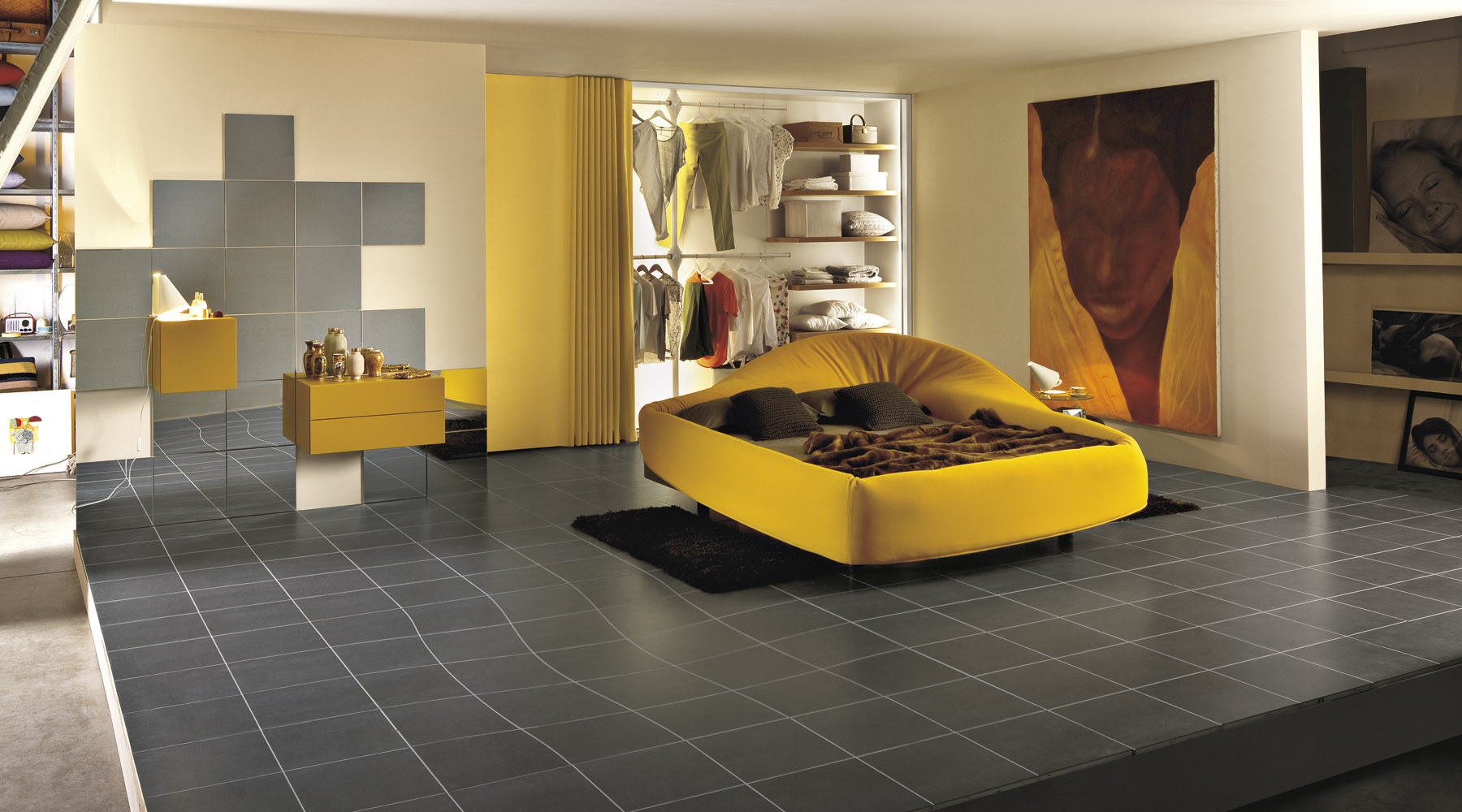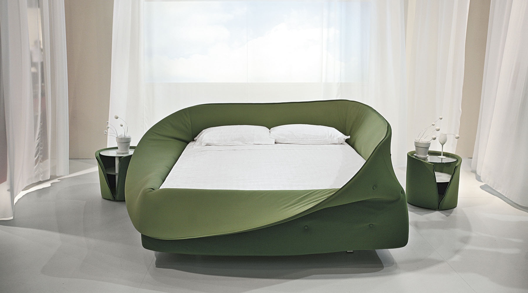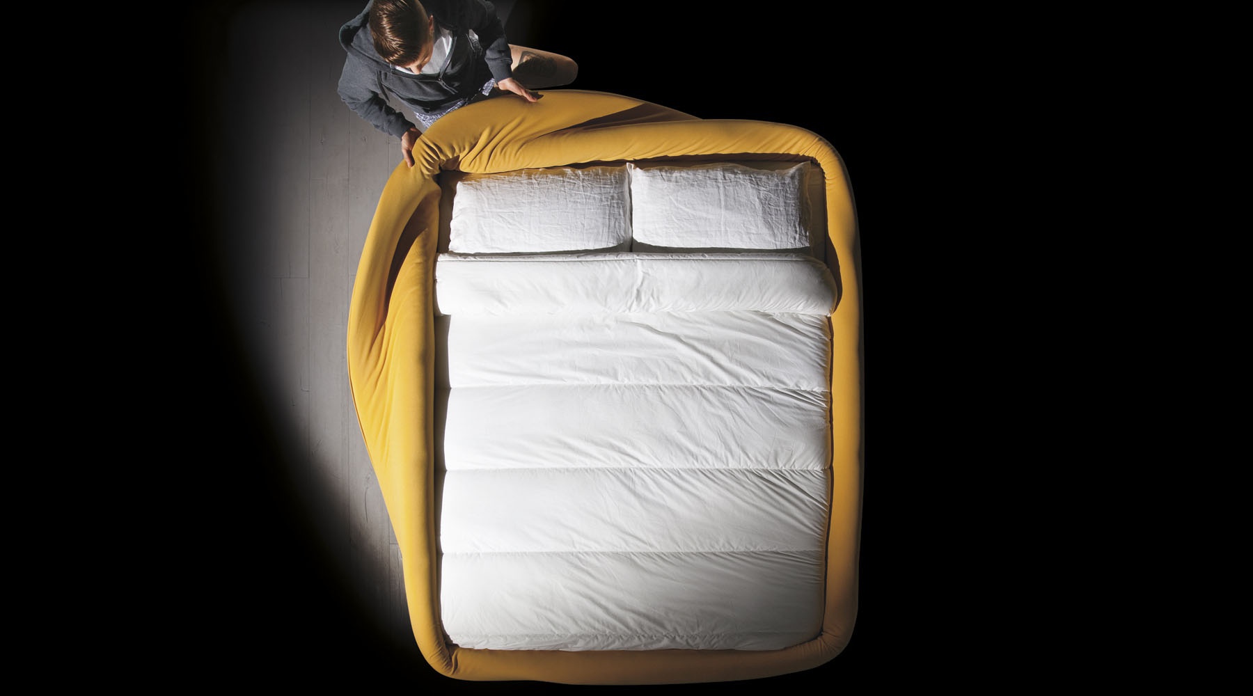 Double bed Colletto from Italian manufacturer Lago. The model is made with special and unusual design. The bed and the turtleneck can be rolled up or down depending on your mood. You can choose different aesthetic and emotional configurations: open, semi-closed or closed. Without corners, allowing you to use rooms for teenagers. Made of two-tone stretch fabric that ensures easy maintenance. Elastic fabric is removable, can be washed and ironed.