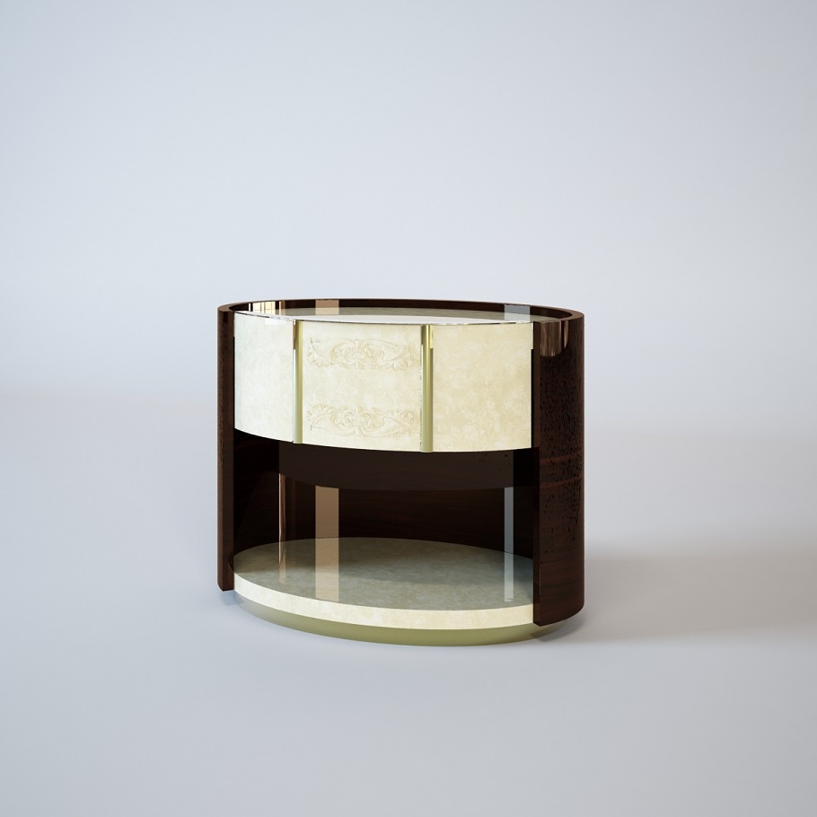 The bedside table from Couture Italian manufacturer Turri. The model of a spherical shape. The frame is made of wood. Surface finish - polyester painting, color - beige, brown, gold. Decor floral ornament stands in the panel products and metal moldings, gilded. The dresser is provided with a niche, hidden behind the transparent glass. Great choice for the bedroom in a simple style.