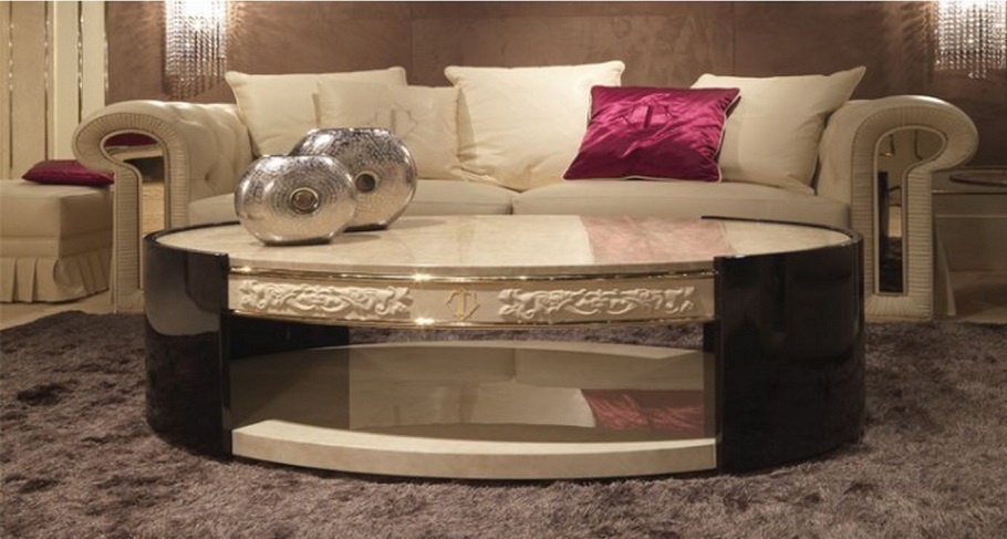 Coffee table Couture collection from Italian manufacturer Turri. The model of a spherical shape. The frame is made of wood. Surface finish is made of polyester, glossy, color: beige, brown, gold. The decor is a floral ornament on the panel of a drawer. The product in a modern style with classical music - a perfect choice for a dressy living room.
