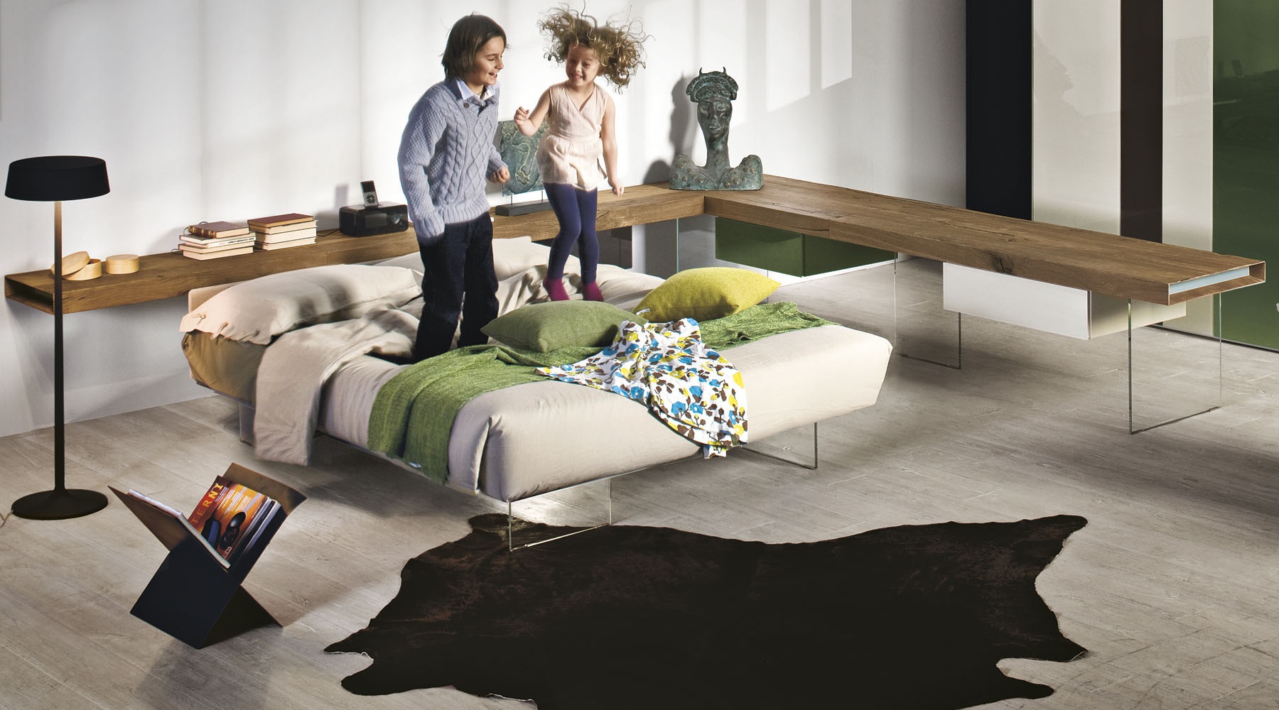 Double bed Air Wildwood from the Italian manufacturer Lago. The frame is made from wood-based database of tempered glass. Rectangular headboard made of oak almost like the trunk of a 200-year-old tree. The texture of the finish exalts the natural appearance of the wood fibers and does not hide signs of wear over time. Transparency and the pristine perfection of the glass is opposed to the imperfection of the tree.