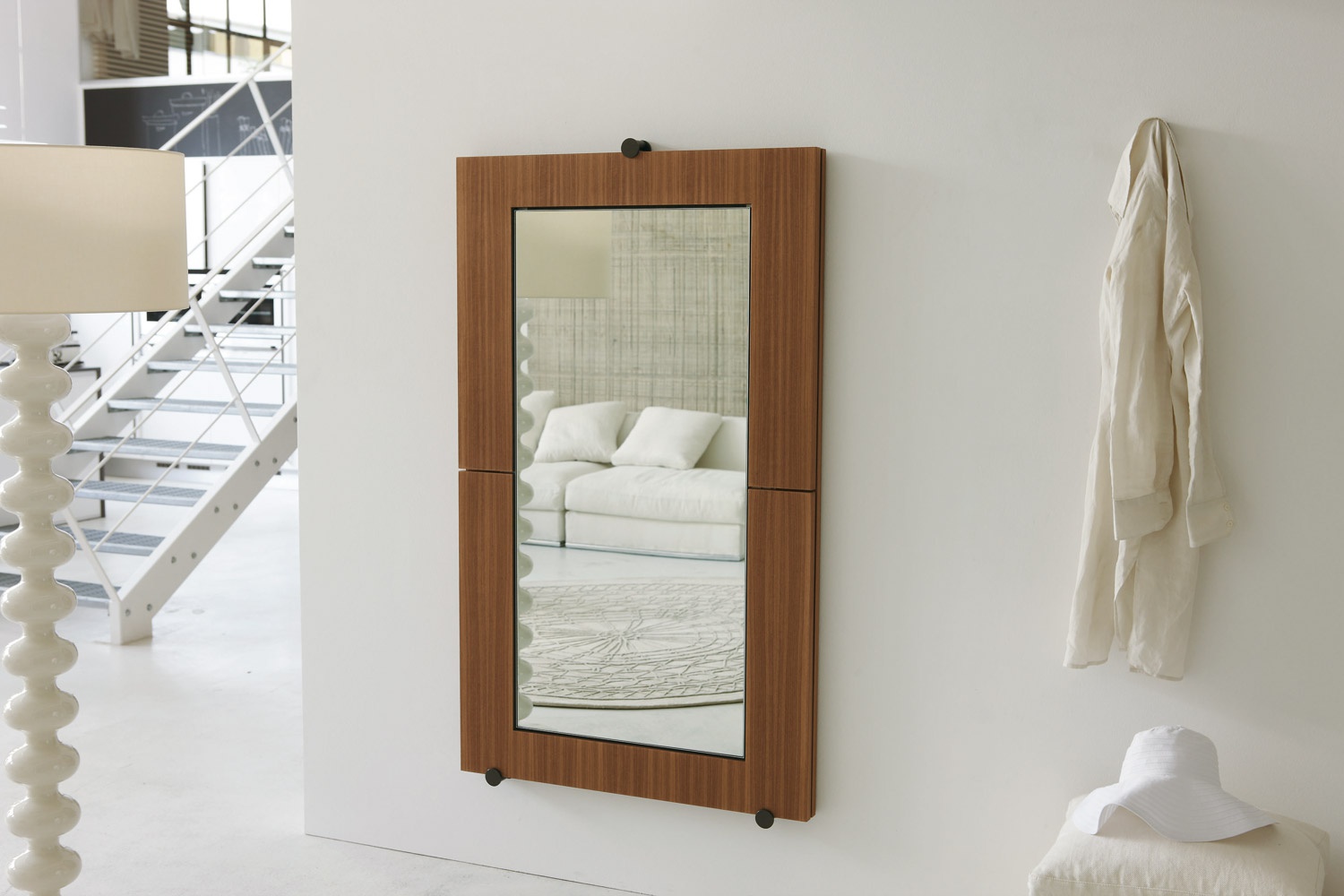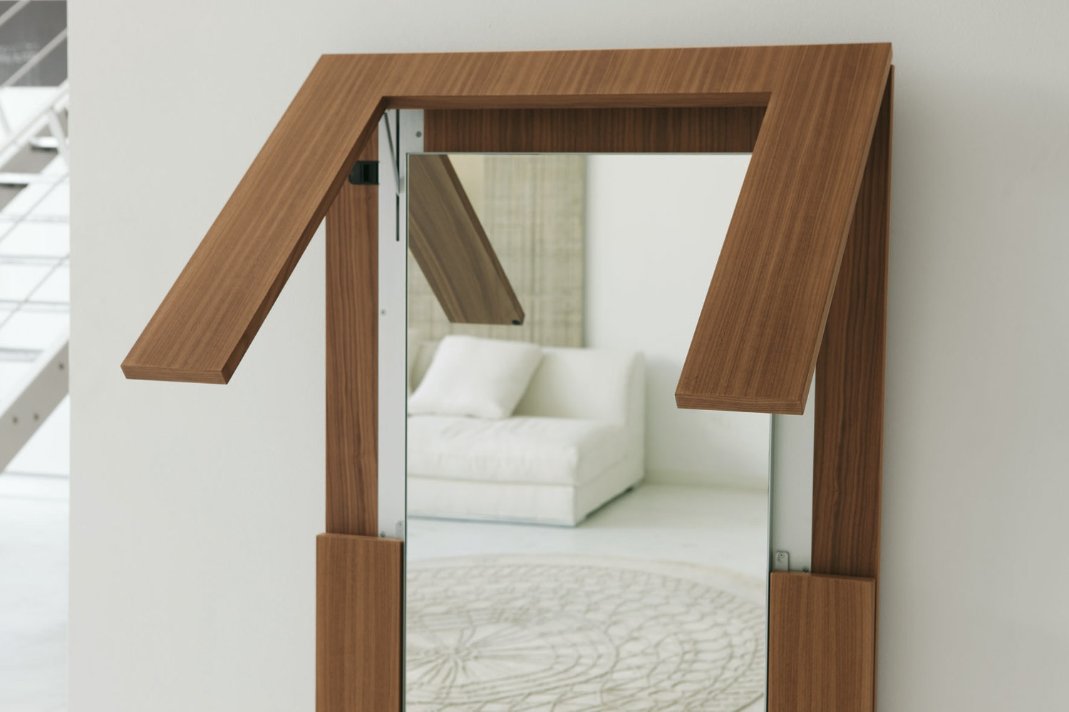 Desk-mirror Tip Over from the Italian manufacturer Porada. Folding dining table-transformer: slight movement turns into outdoor mirror. The legs fold under the table top, the surface of which the reverse side is mirrored. The resulting flat construction are invited to flip and mirror finish. Model made of solid wood.